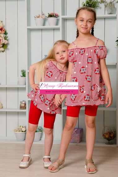 Майка детская летняя. Свободного А-силуэта на тонких бретелях. С двумя декоративными кармашками, на которых настрочены бантики из атласной ленты. Горловина и рукава собраны на кружевную резинку. Все срезы в изделии обработаны декоративной краеобметочной строчкой.