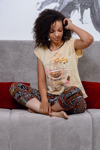 Пижама женская: футболка с короткими рукавами, с крупным принтом на полочке и брюки с 2 карманами.