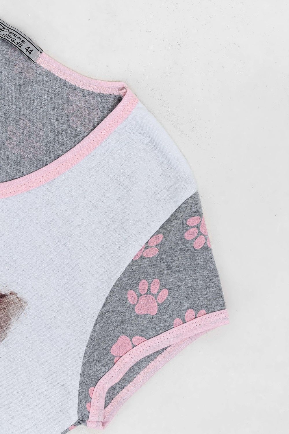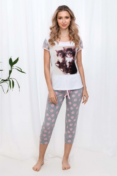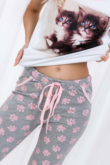 Пижама из кулирки футболка + бриджи. Светлая футболка с розовой окантовкой, принт в виде котят, серые вставки с кошачьими следами. Серые бриджи с узором в виде следов, розовая окантовка карманов, шнурок на поясе, длина чуть ниже коленей.