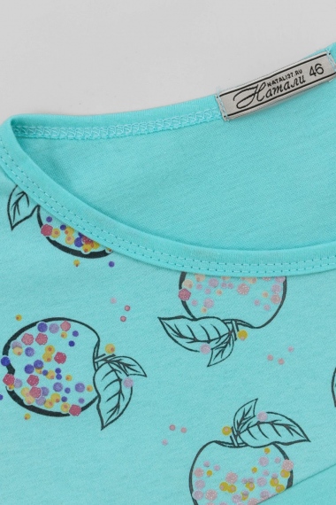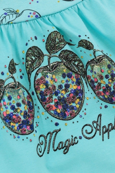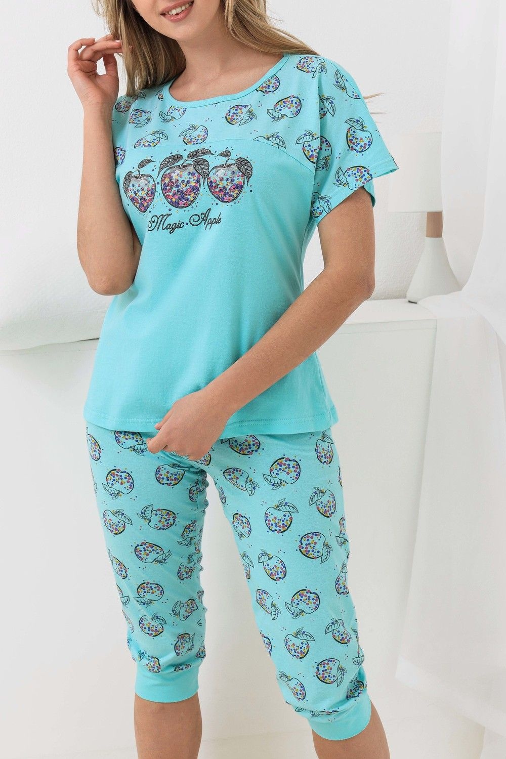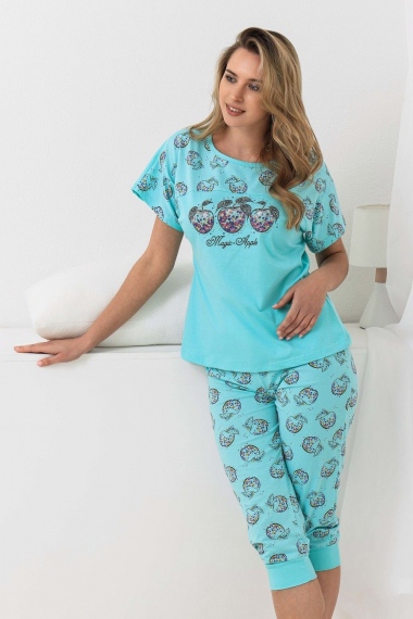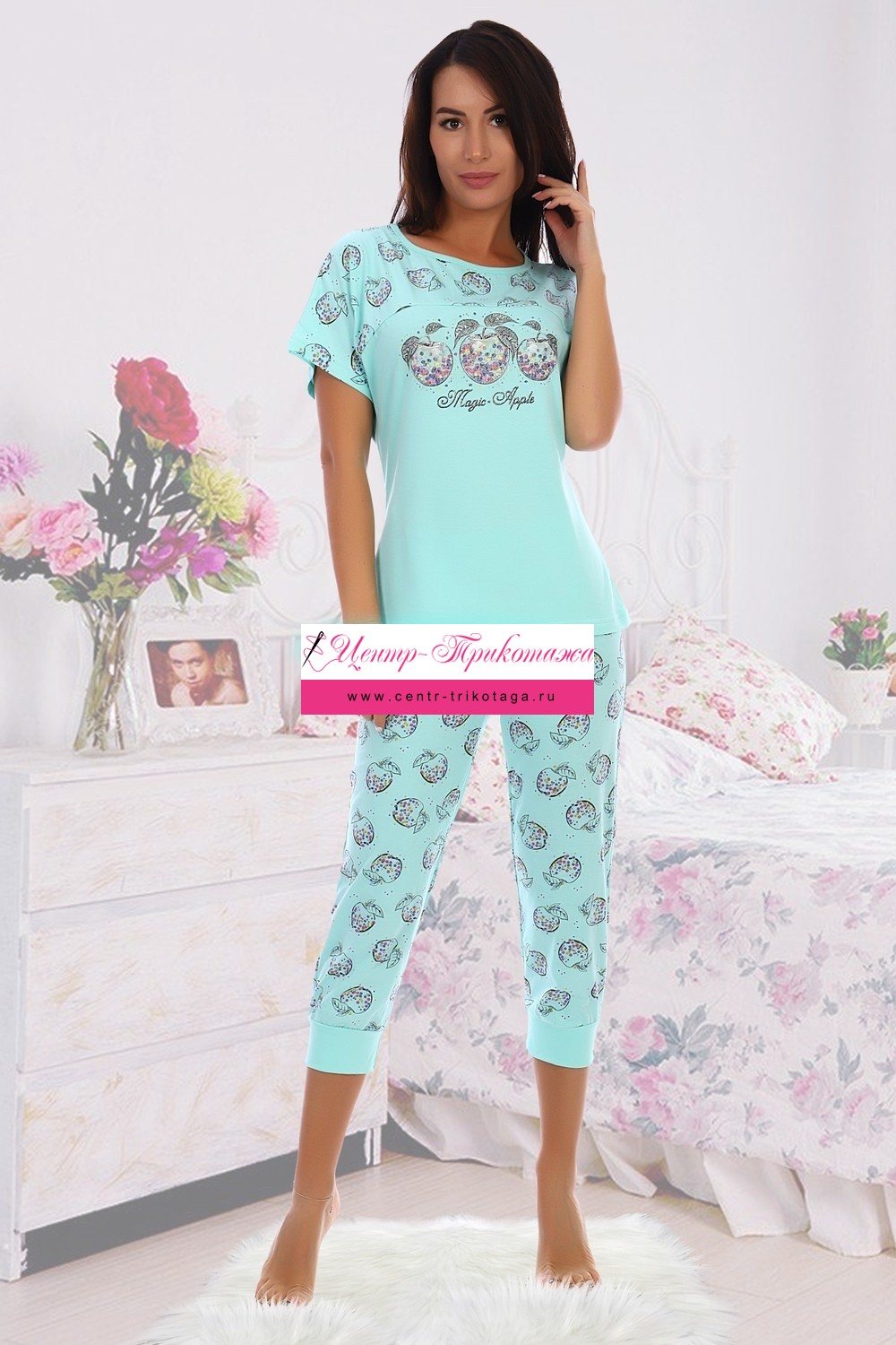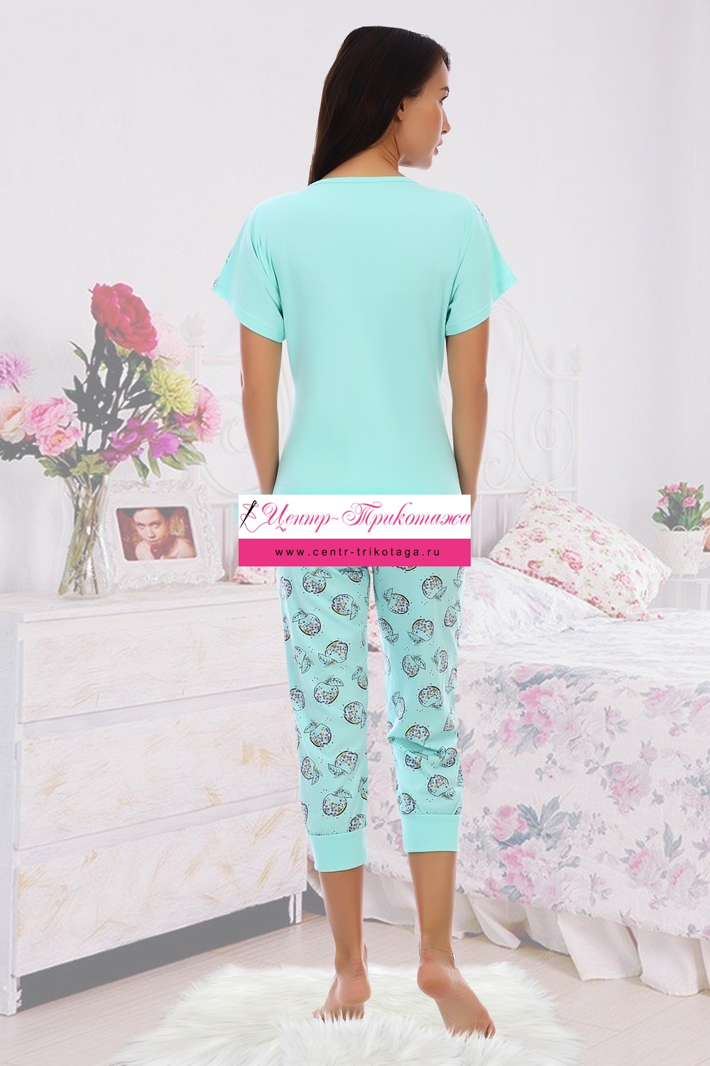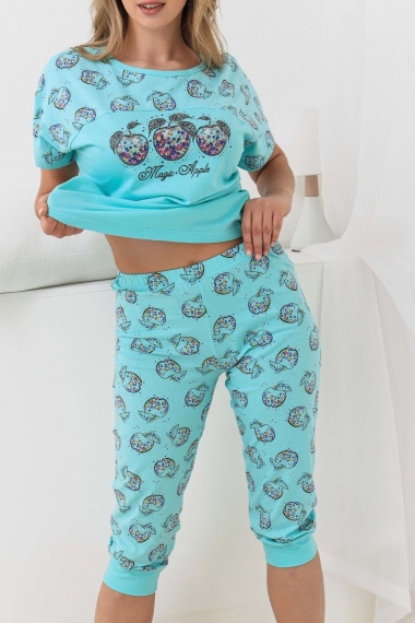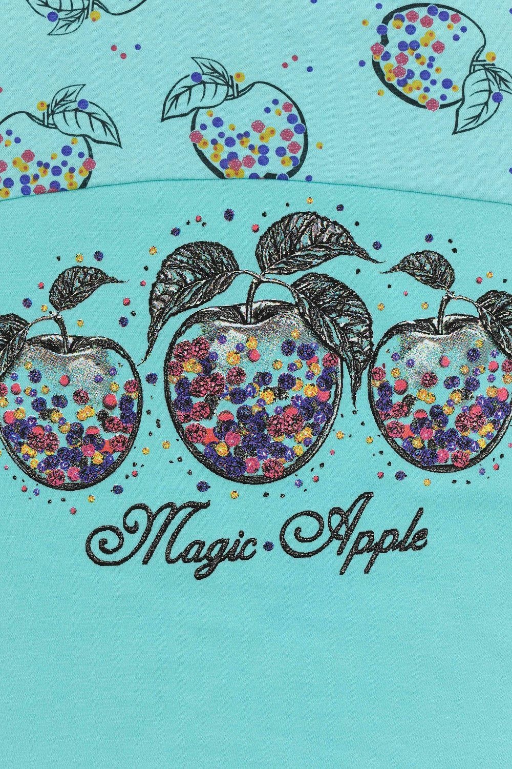 Пижама с цельнокроеным рукавом и контрастной кокеткой с рисунком. Бриджи на плотно прилегающей к ноге манжете. Очень удобный крой. Печать - три яблочка с глитером.