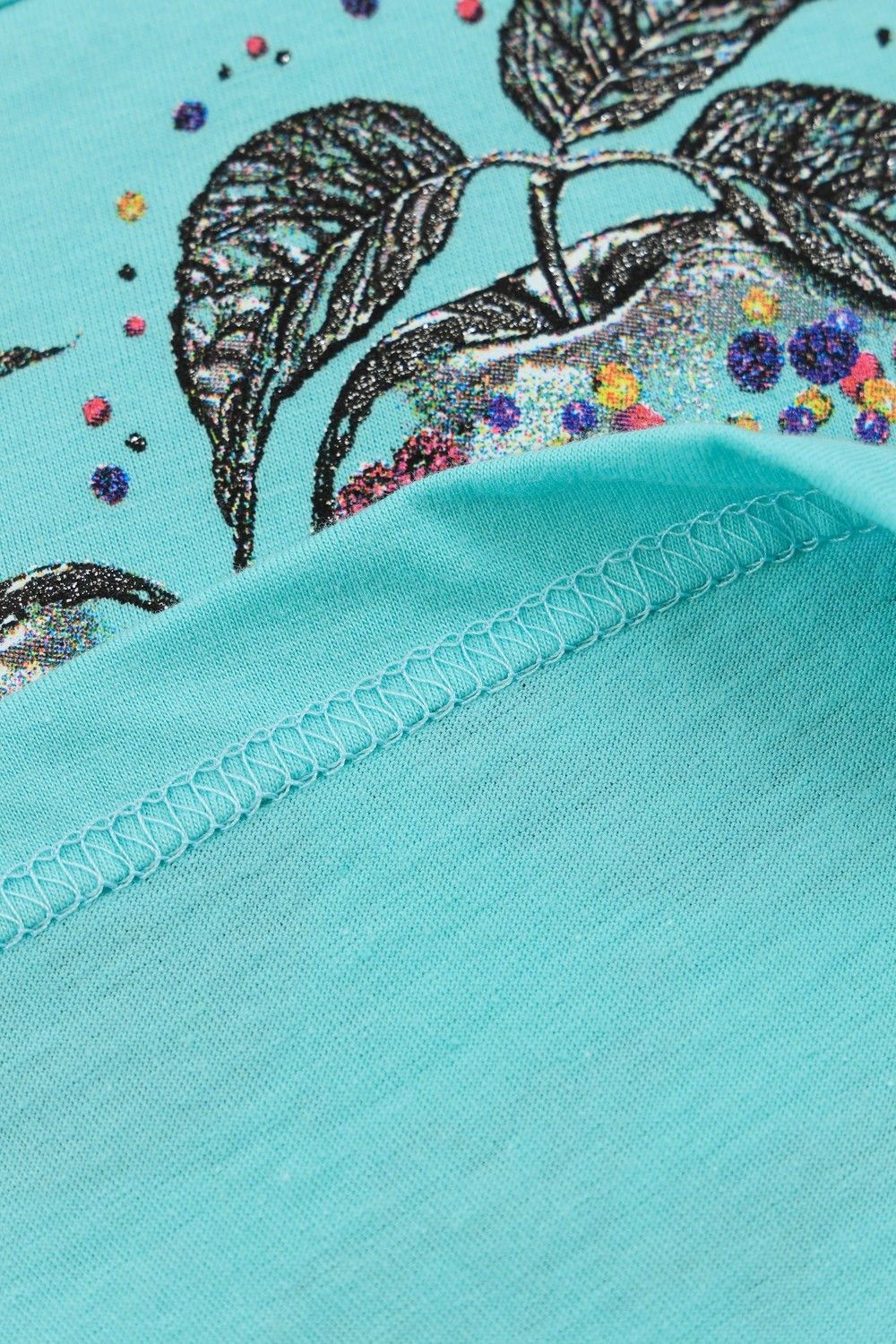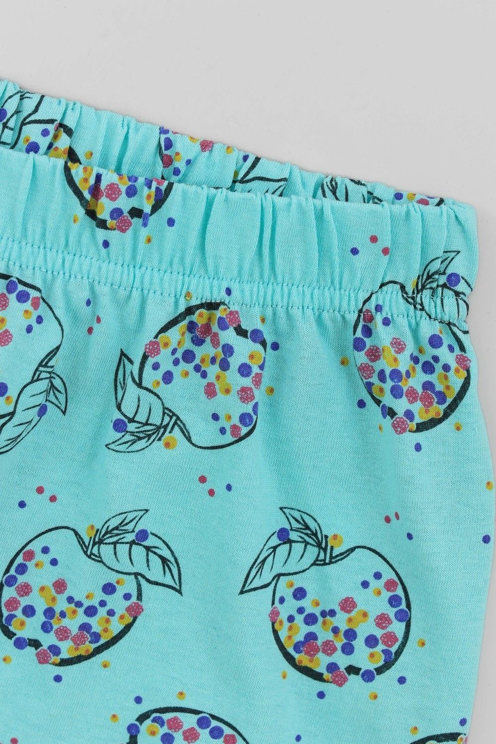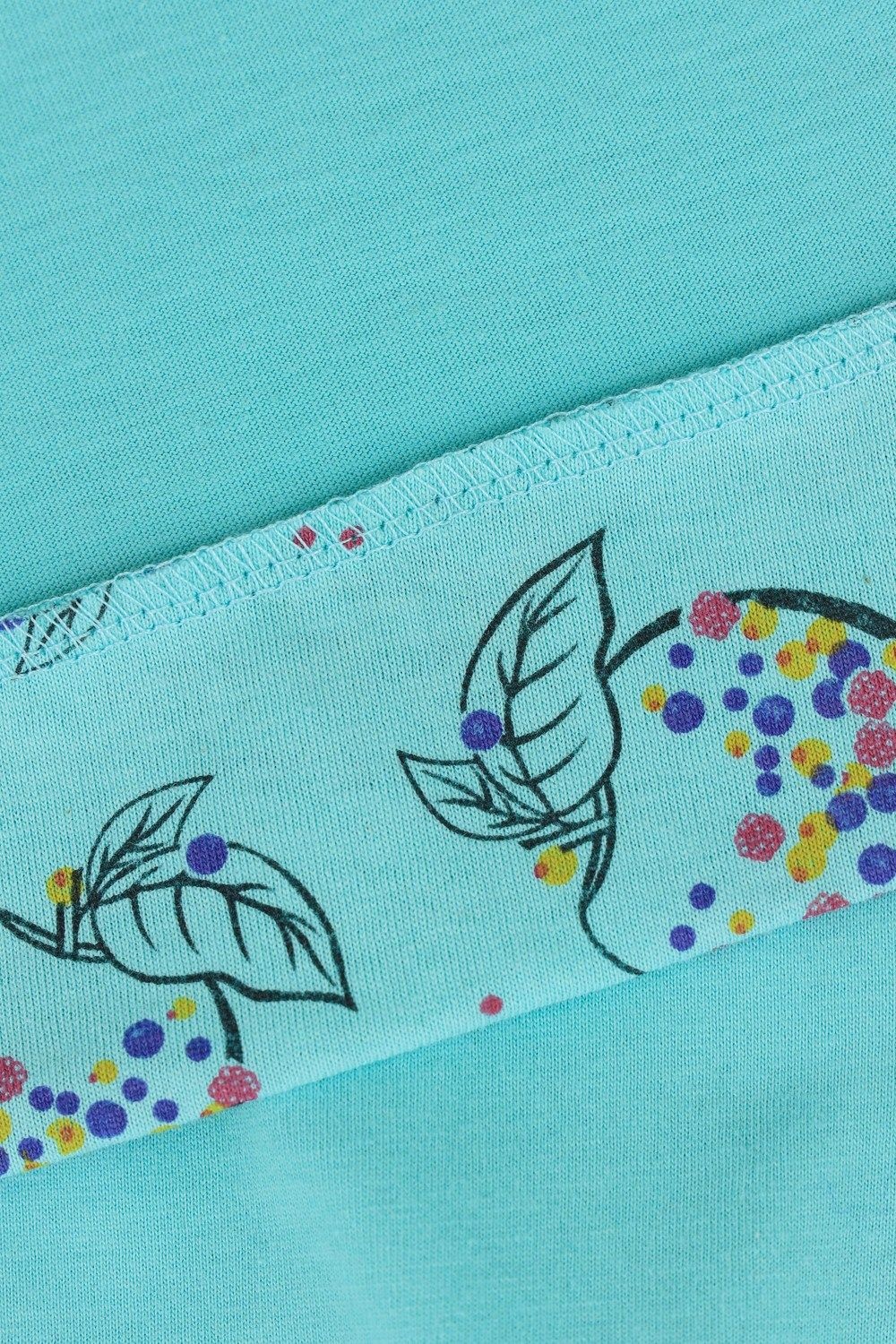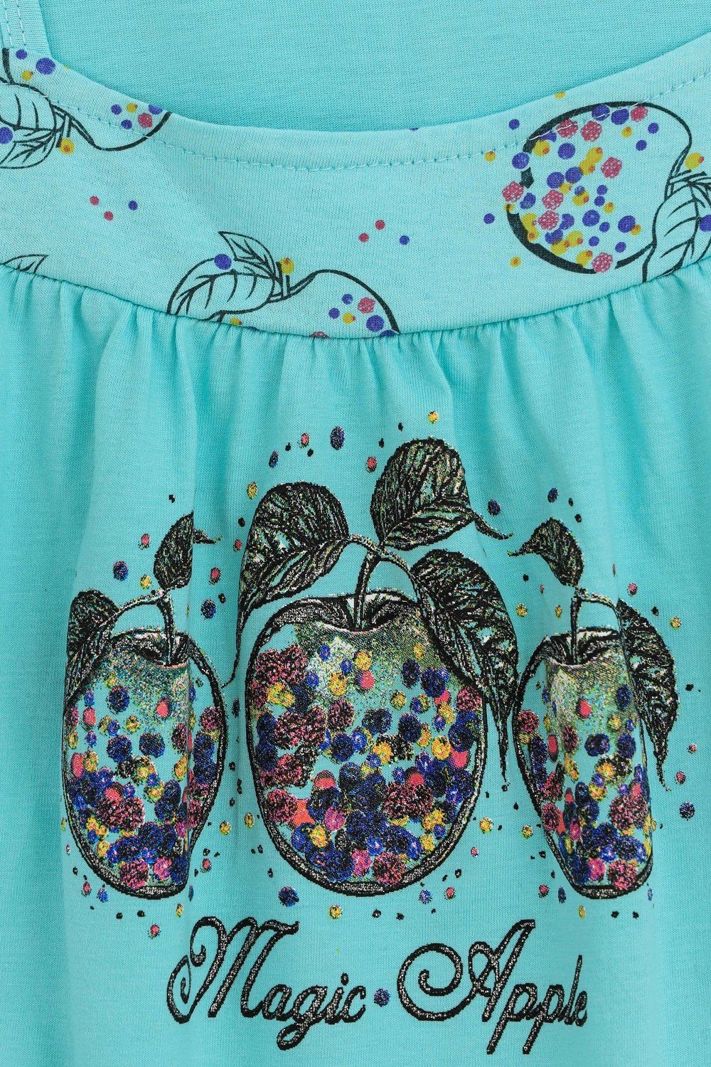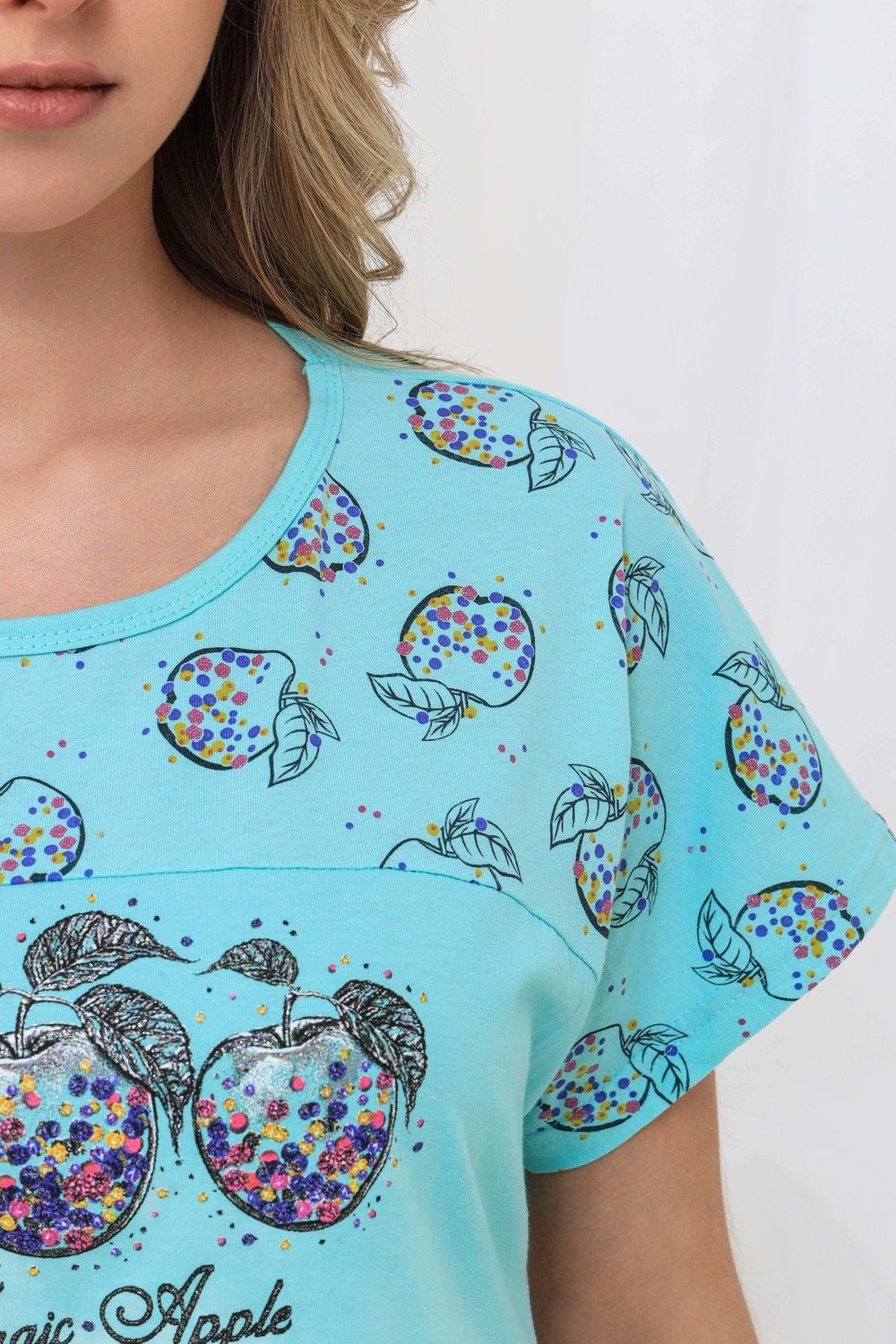 Пижама с цельнокроеным рукавом и контрастной кокеткой с рисунком. Бриджи на плотно прилегающей к ноге манжете. Очень удобный крой. Печать - три яблочка с глитером.