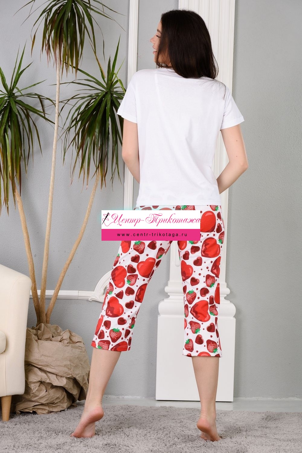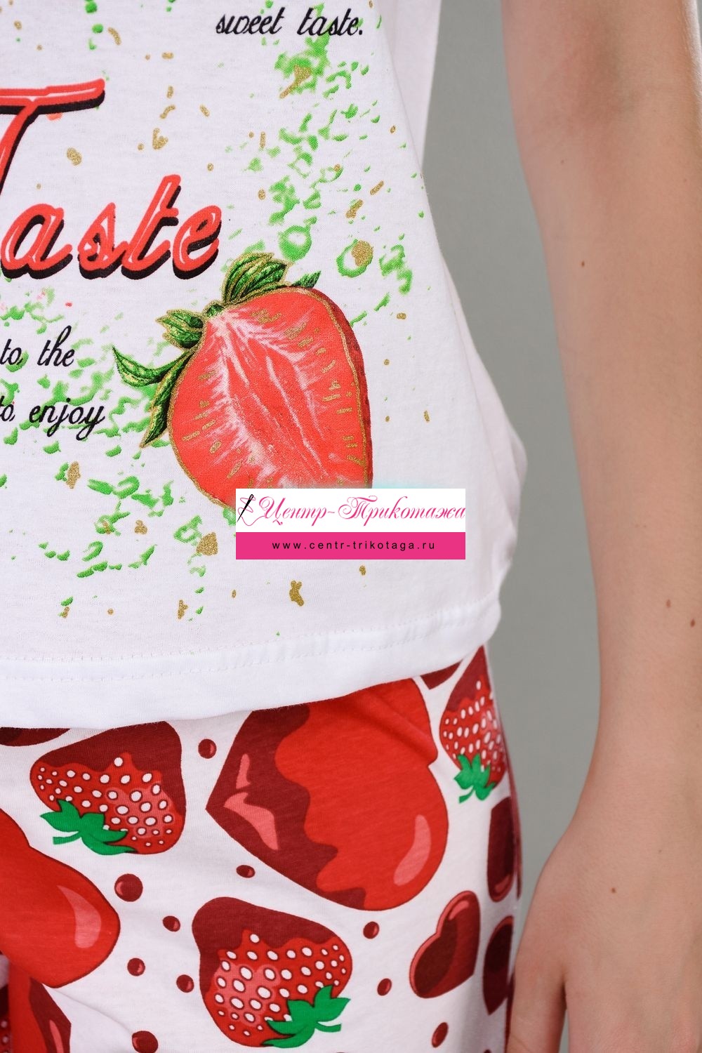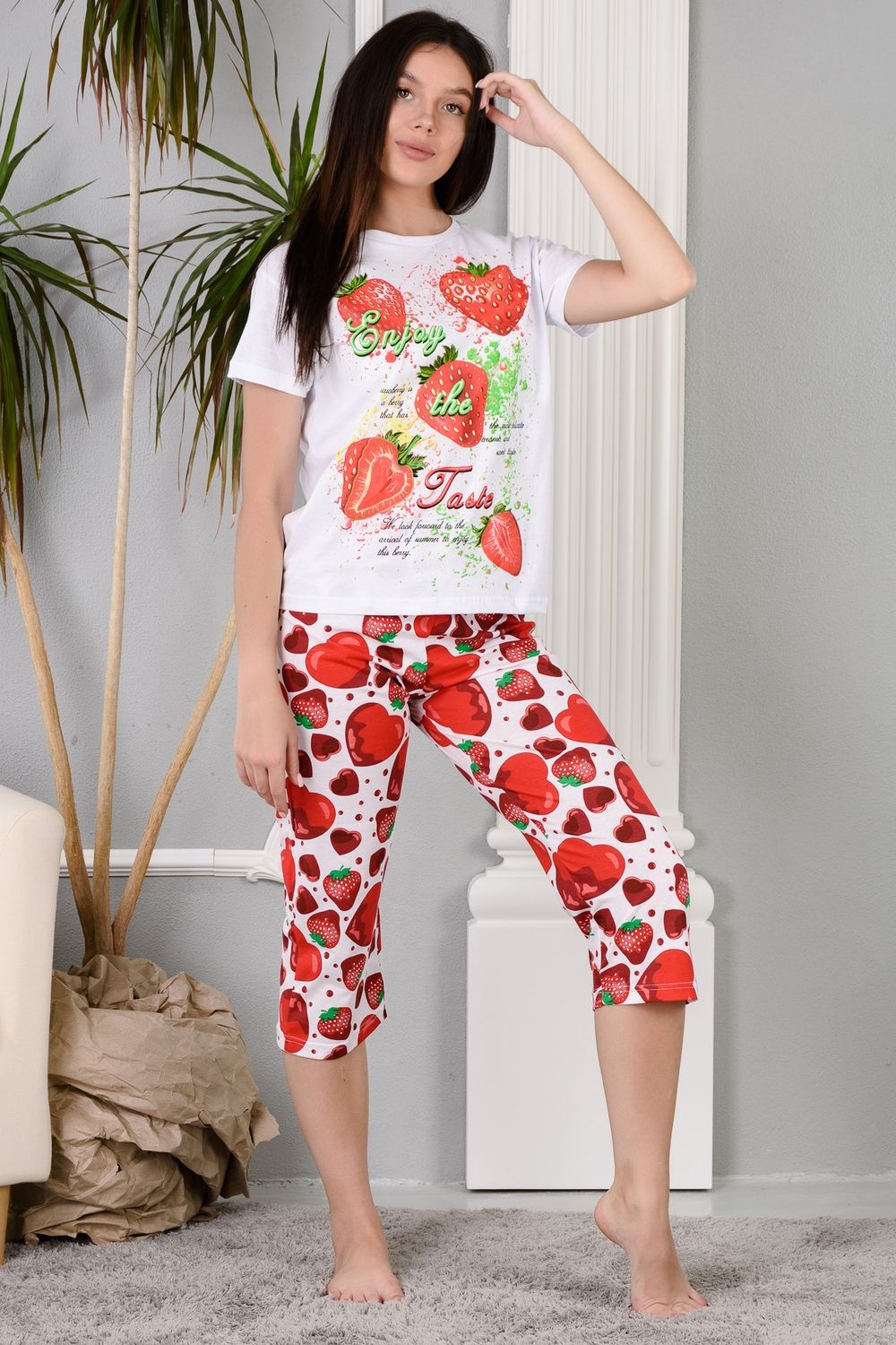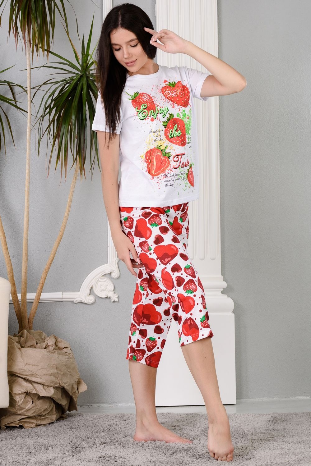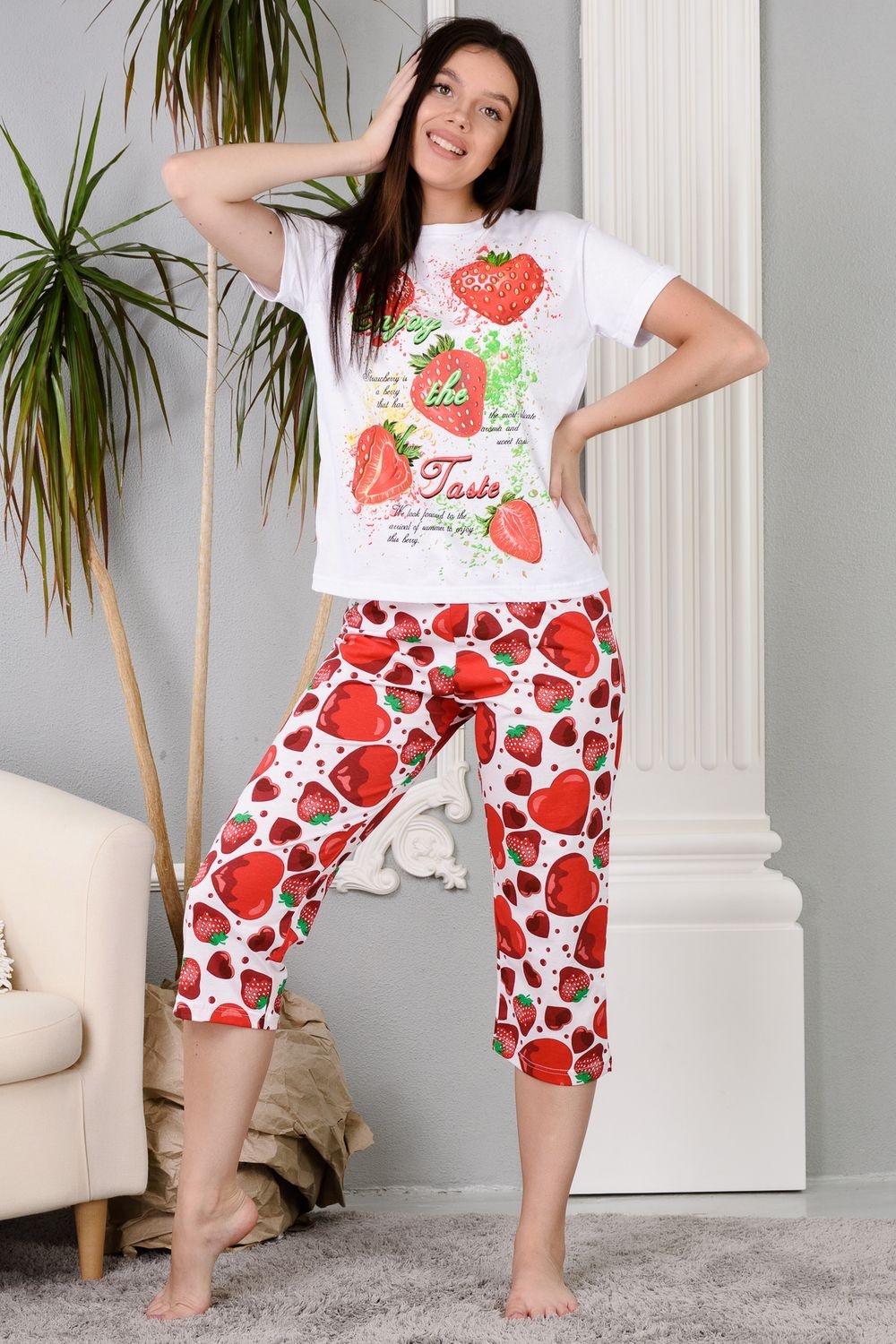 Уютная клубничная пижамка. Футболка со спущенной линией плеча, бриджи свободного кроя. В этой пижаме удобно спать, проводить время дома и на отдыхе.