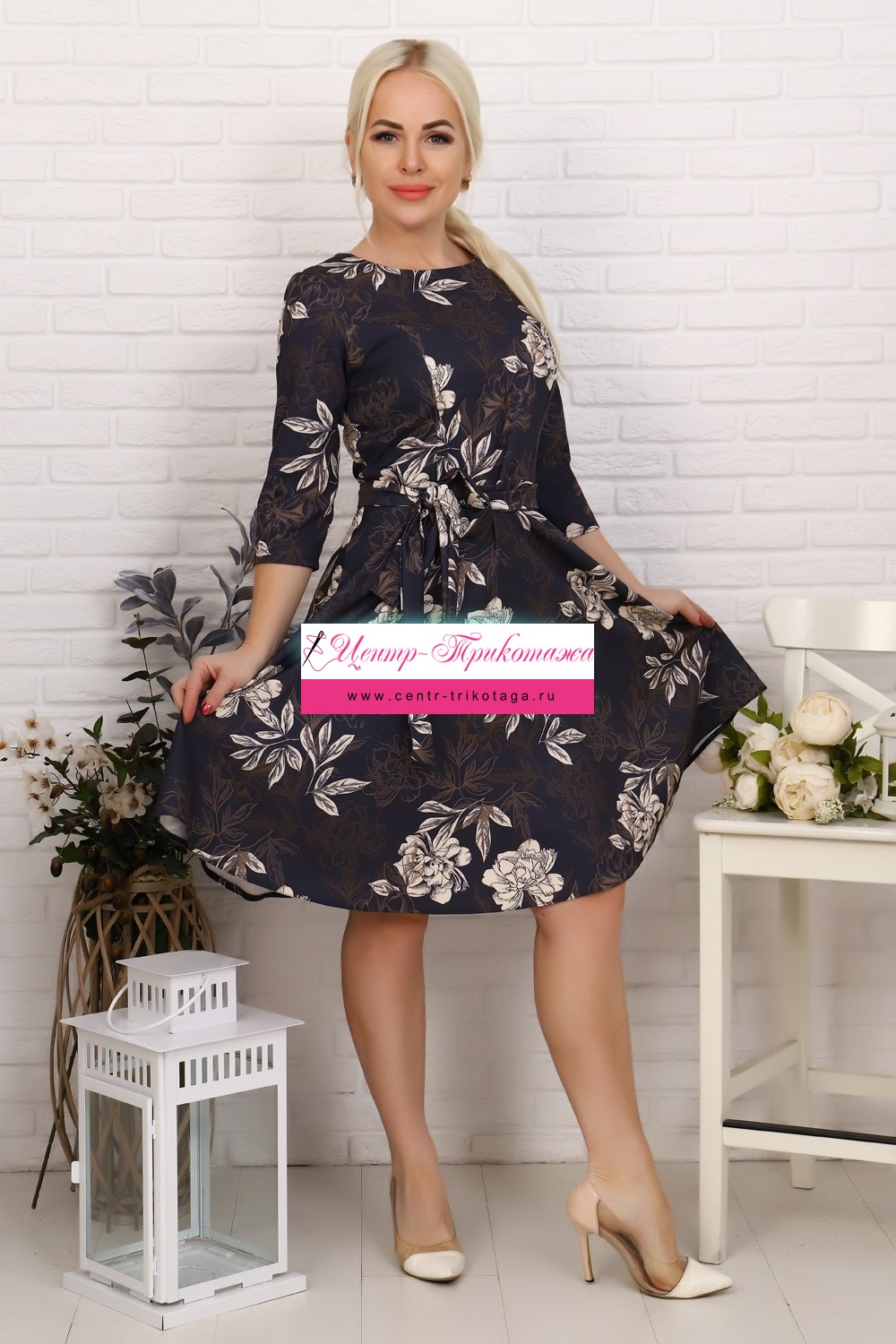 Платье-миди с приталенным верхом и струящейся юбкой, с поясом. На спинке застежка-молния. Рукав 3/4