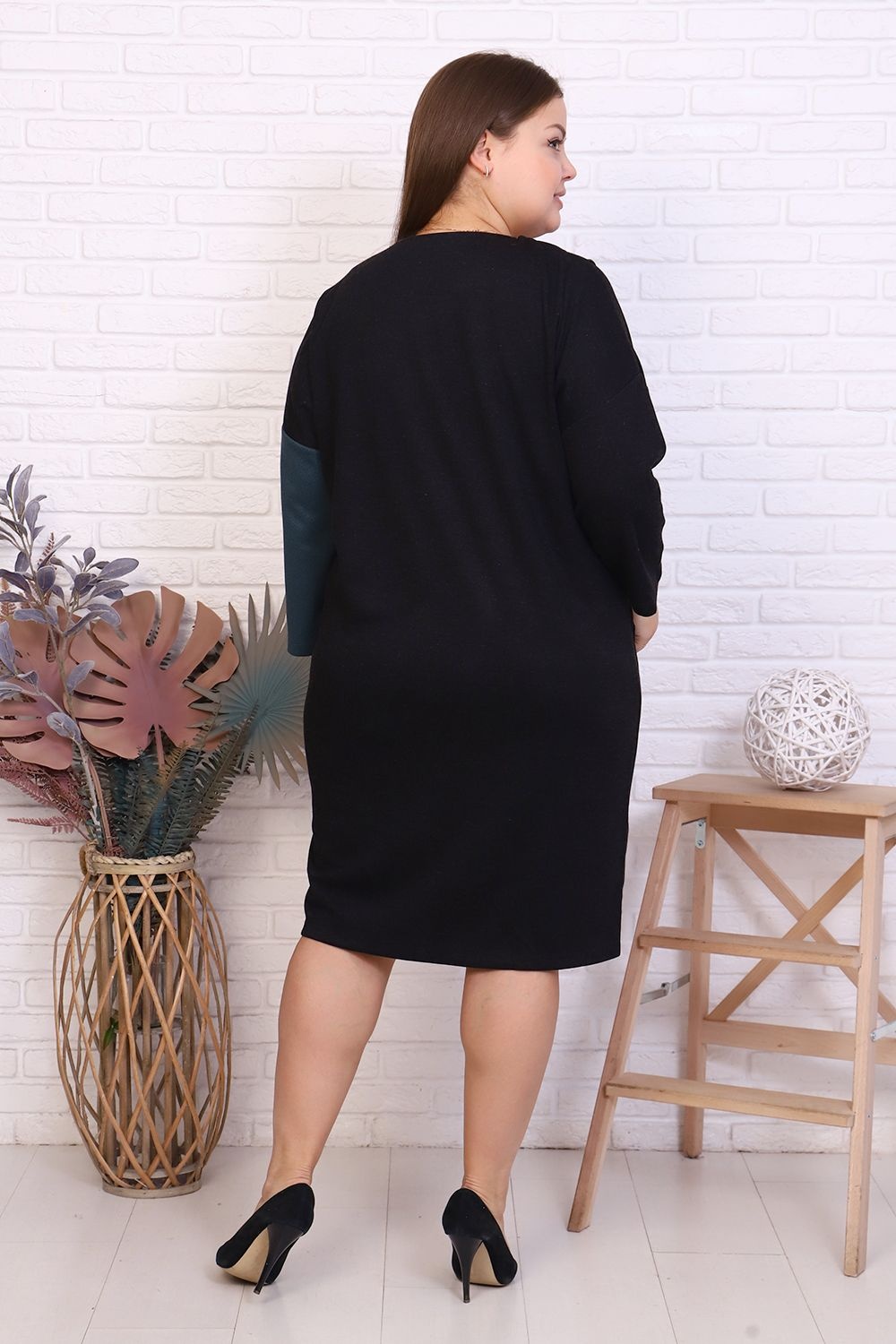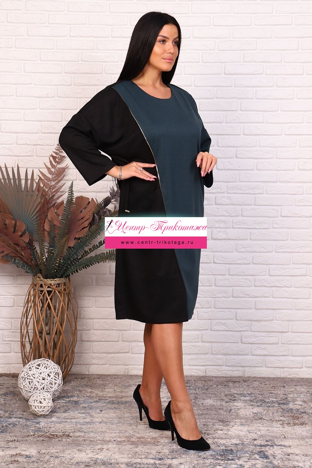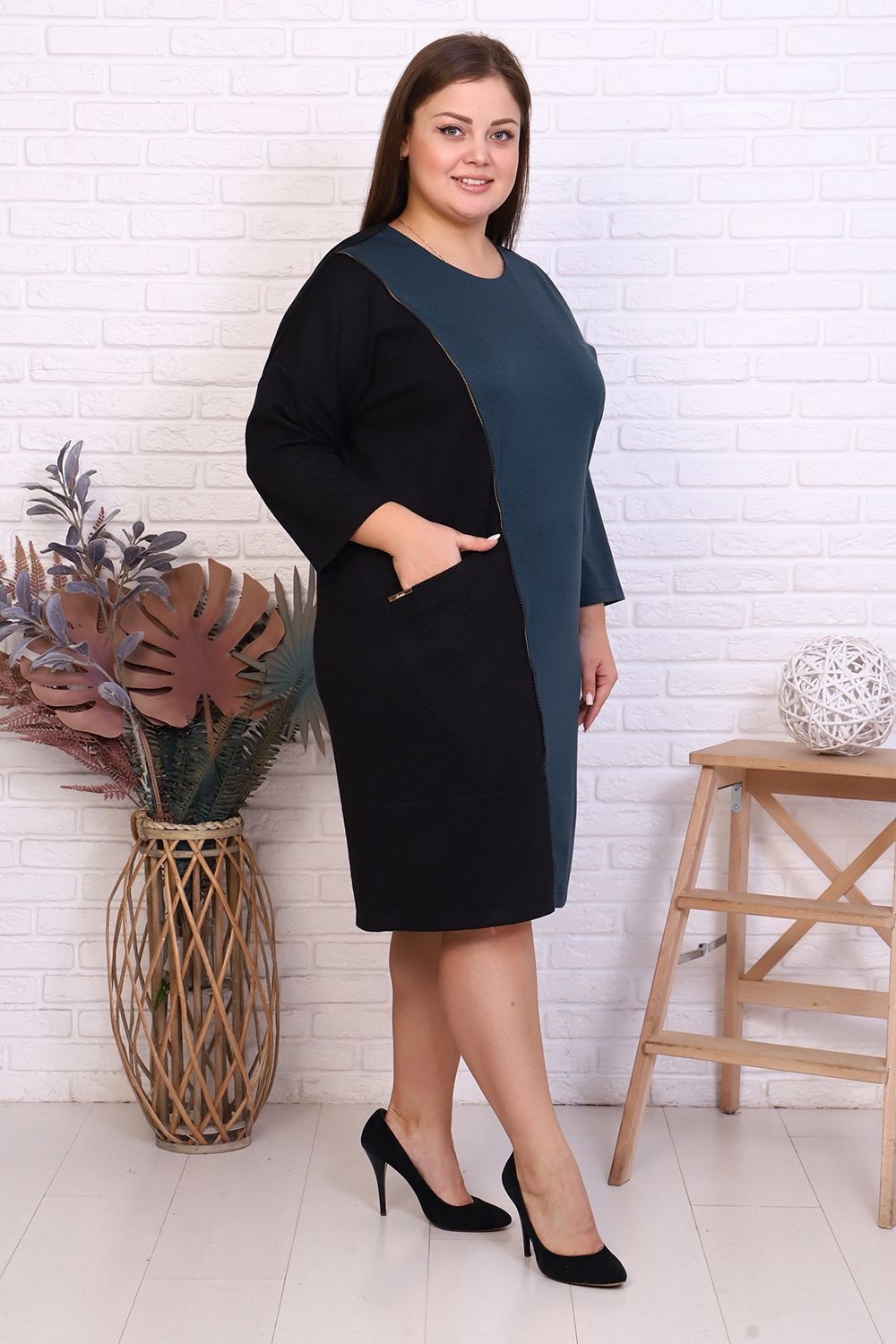 Платье прямое свободного кроя. Округлая горловина. Плечо спущенное, рукав 3/4. Передняя полочка разделена декоративной молнией, накладной карман. Длина средней длины.