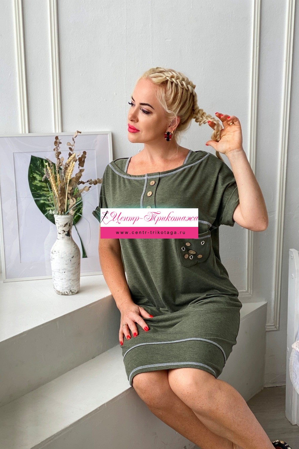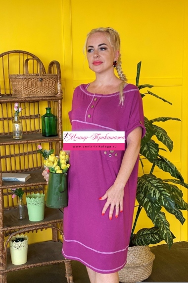 Платье женское прямого силуэта. На полочке и спинке кокетки. Рукав цельнокроенный с притачной манжетой на пуговице. На кокетке полочки планка с тремя декоративными пуговицами. На полочке нагрудный карман с тремя люверсами и четырьмя пуговицами. Шов притачивания нижней части платья, швы притачивания кокеток, планки и горловина отделаны контрастной декоративной строчкой. На нижней части спинки шлица на двух пуговицах.