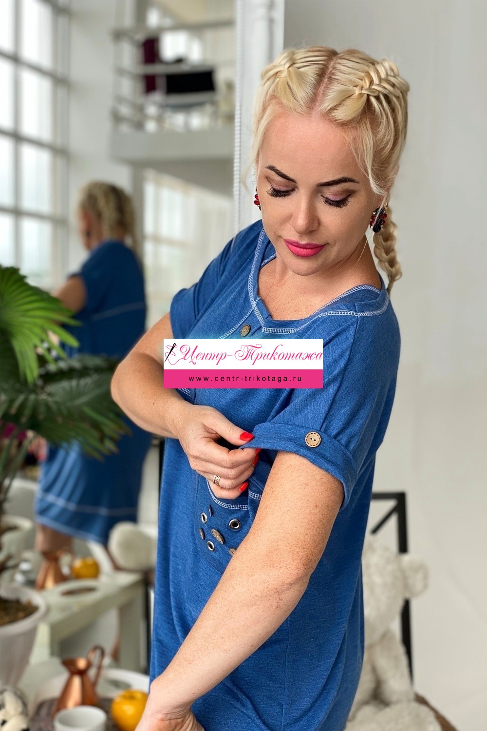 Платье женское прямого силуэта. На полочке и спинке кокетки. Рукав цельнокроенный с притачной манжетой на пуговице. На кокетке полочки планка с тремя декоративными пуговицами. На полочке нагрудный карман с тремя люверсами и четырьмя пуговицами. Шов притачивания нижней части платья, швы притачивания кокеток, планки и горловина отделаны контрастной декоративной строчкой. На нижней части спинки шлица на двух пуговицах.