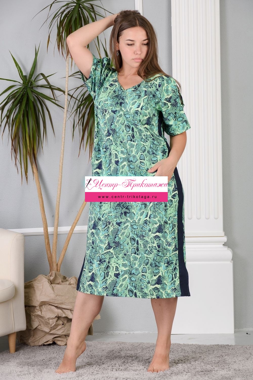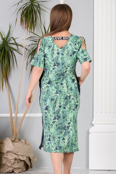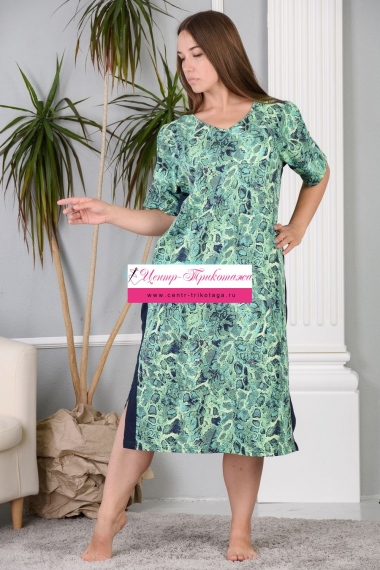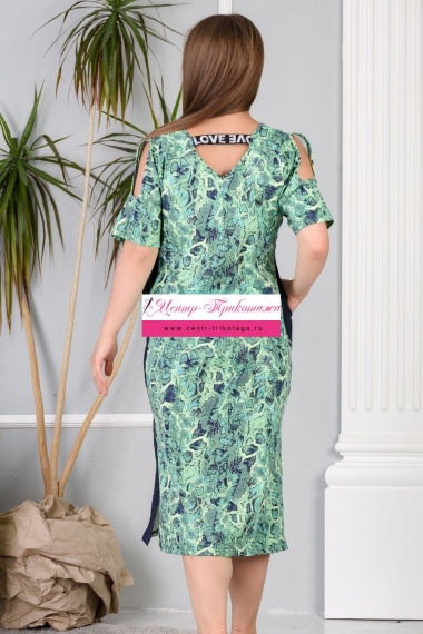 Платье прямое, длинное, с V-образной горловиной, с боковыми карманами. Рукав короткий. На плечах обработаны декоративные вырезы. Полочка с лампасами контрастного цвета вдоль боковых швов. В нижней части боковых швов обработаны разрезы. В верхней части спинки обработан фигурный вырез с резинкой. Горловина и вырезы на плечах обработаны бейкой из основного полотна.