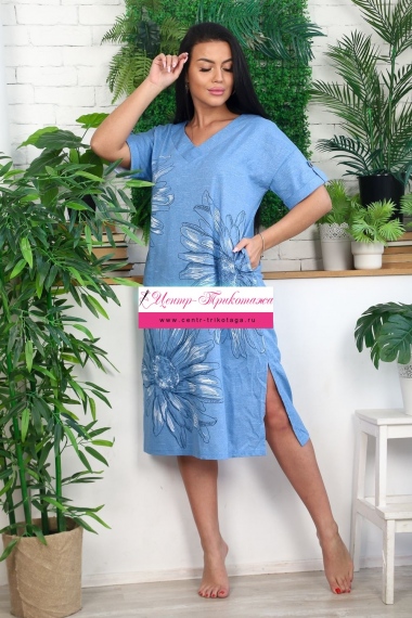 Платье прямого силуэта, с V-образной горловиной спереди и сзади, с карманами, с разрезами в нижней части боковых швов. Рукав короткий, с отложным манжетом и хлястом с пуговицей. Вход в карман обработан бейкой из основного полотна.