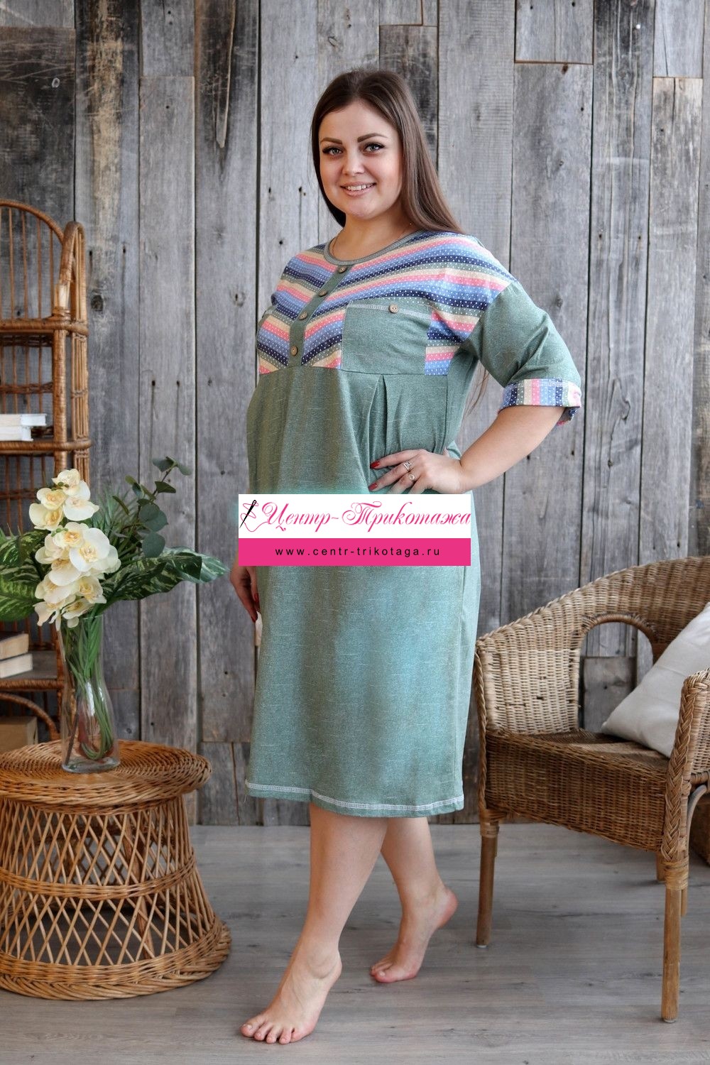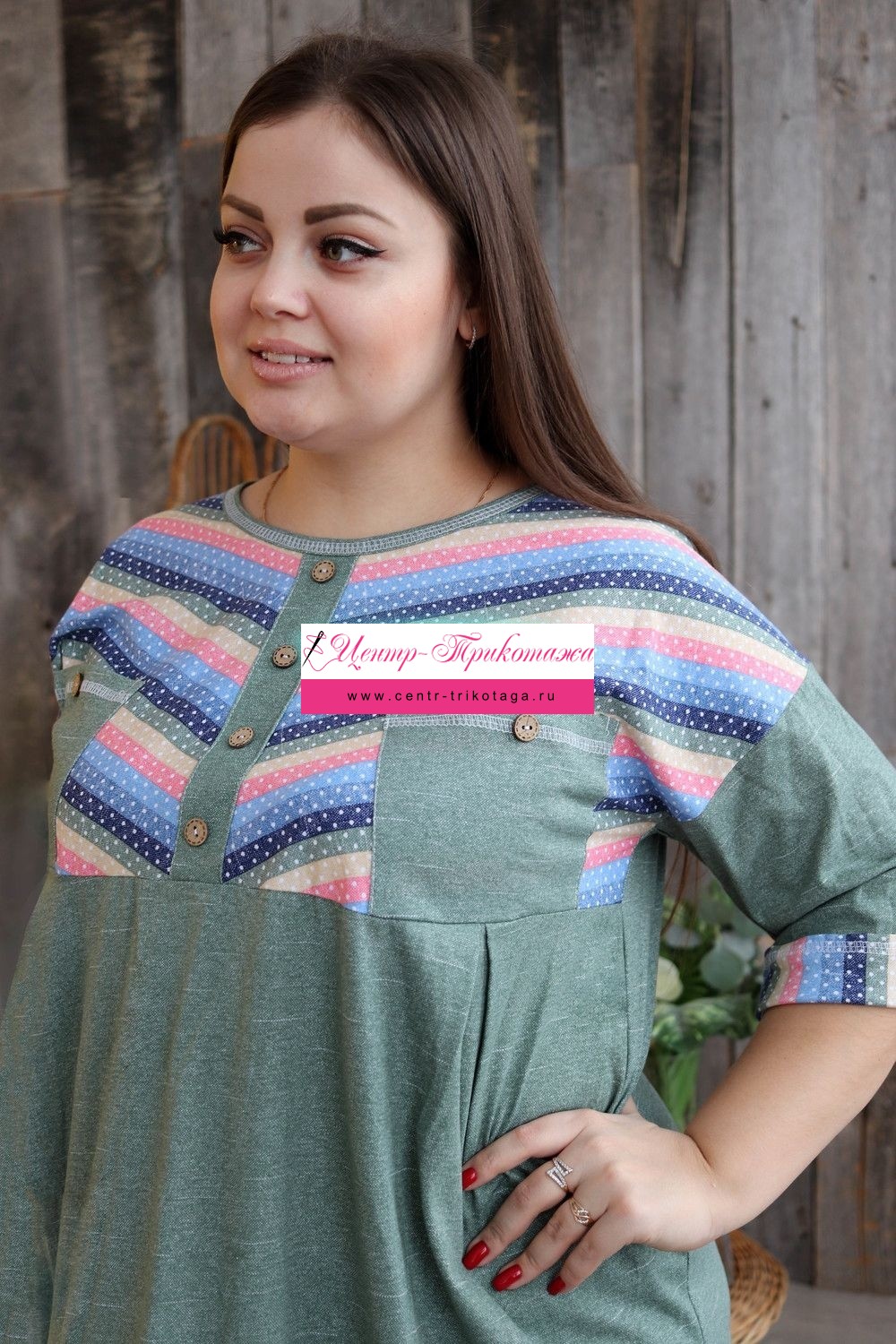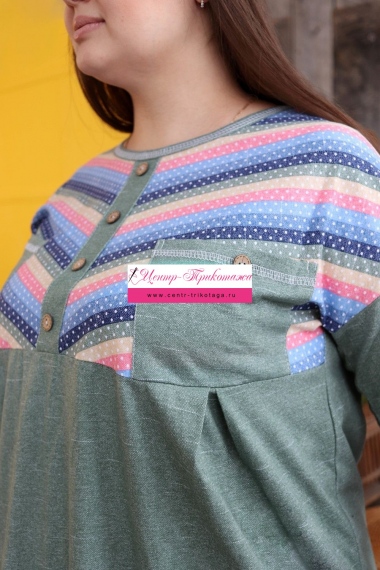 Платье женское прямого силуэта. Рукав цельнокроенный со швом. Верхняя часть полочки и манжета рукава из отделочной ткани в полоску. В верхней части полочки накладные карманы и имитация планки, в нижней: встречные складки, обеспечивающие дополнительную свободу в области талии и бедер. На модели 52 размер