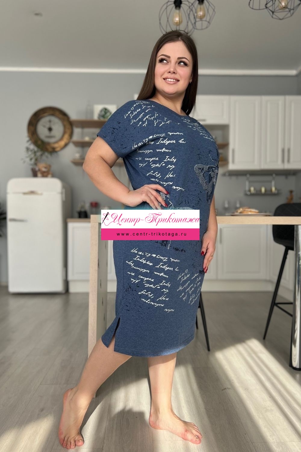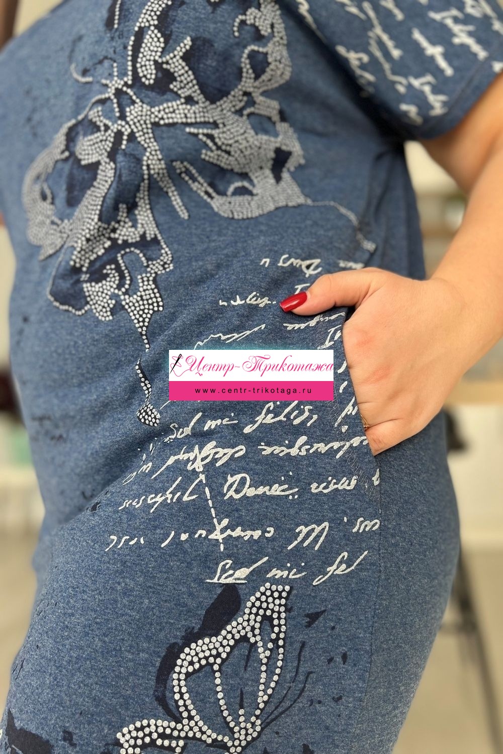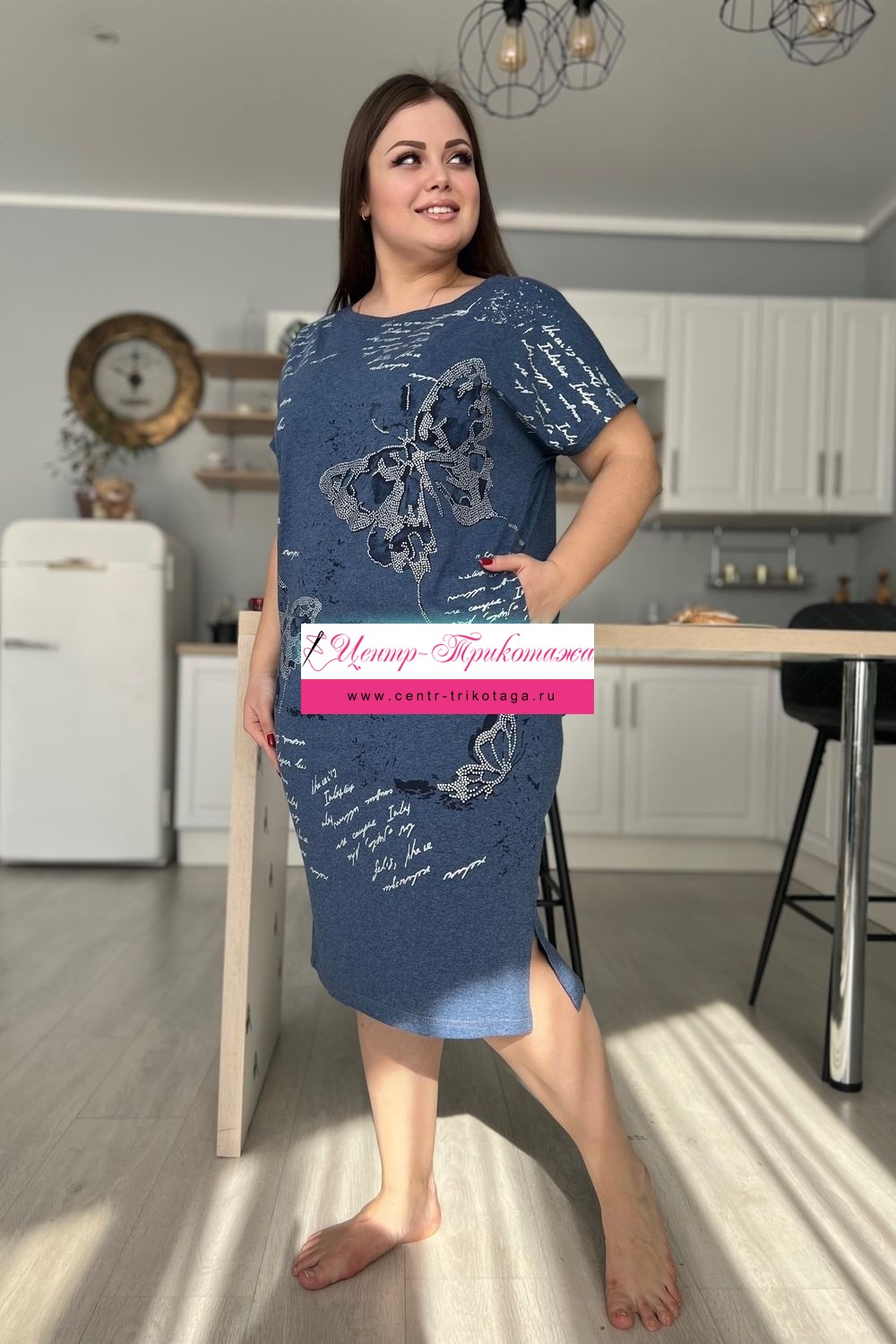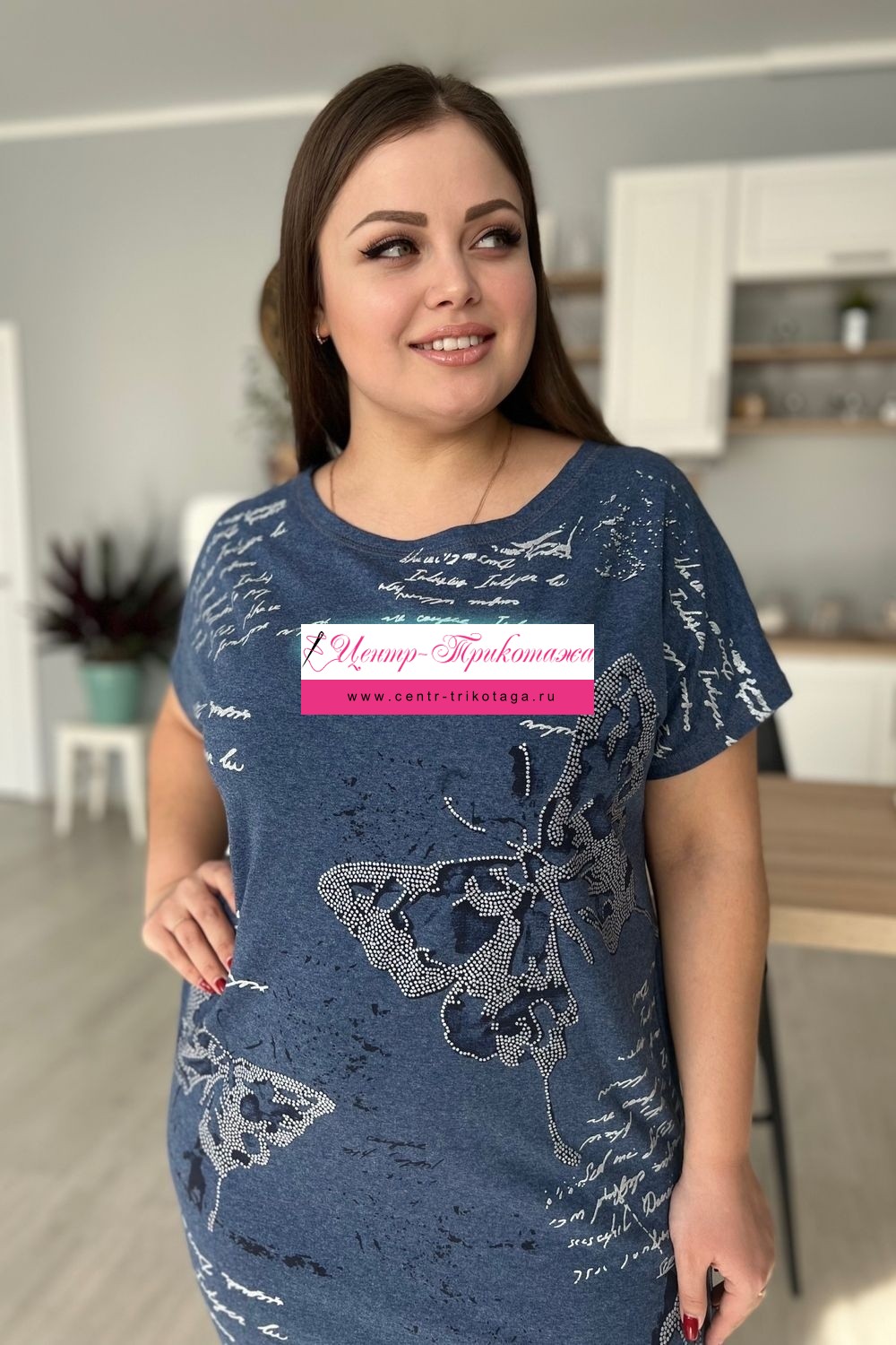 Платье женское прямого силуэта. Рукав цельнокроенный короткий. В боковых швах два внутренних кармана, внизу небольшие разрезы. На полочке красивый принт в виде бабочек. На модели 52 размер