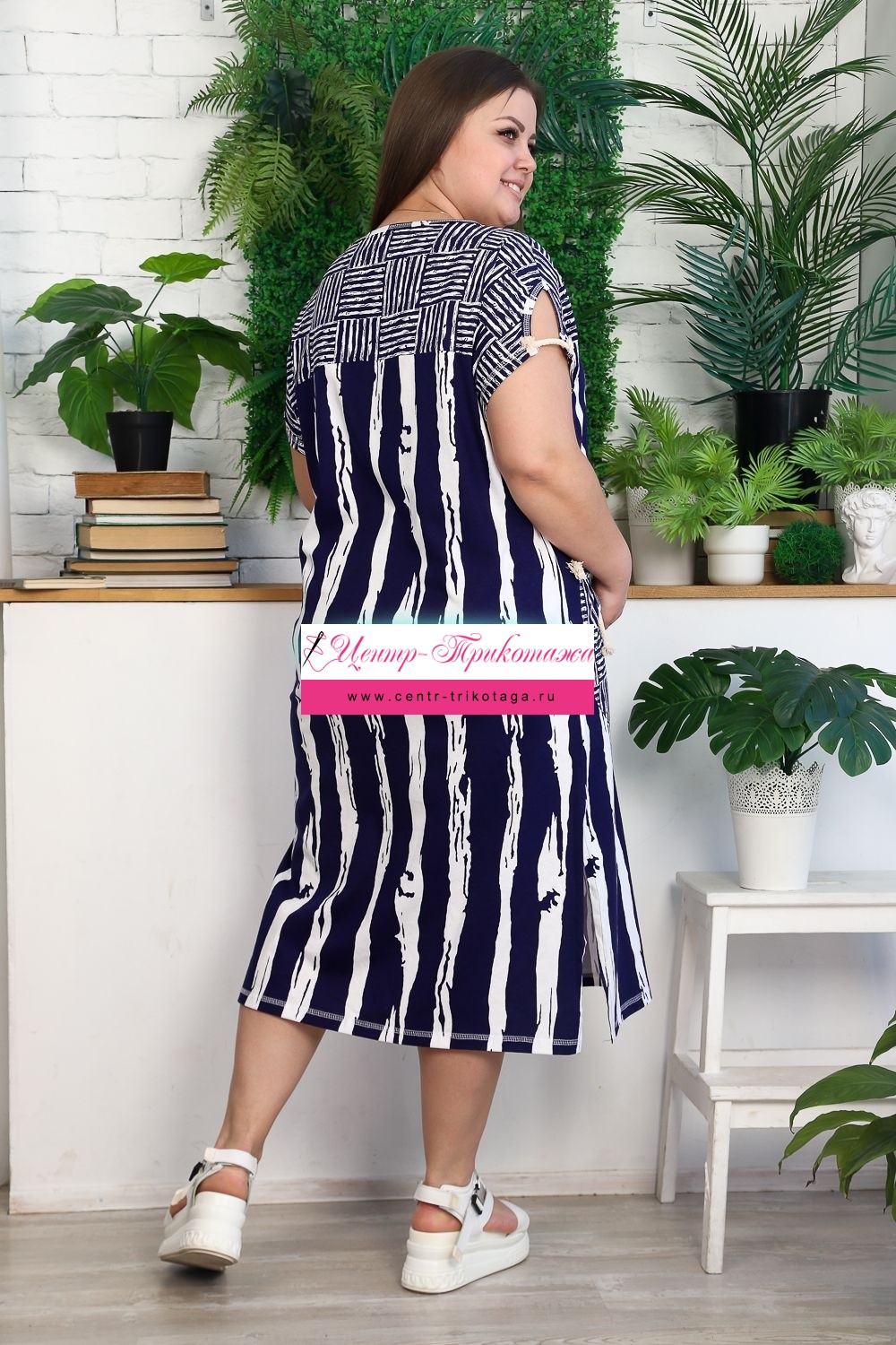 Платье женское полуприлегающего силуэта. Рукав цельнокроенный, спереди имитация реглана, сзади на спинке кокетка. На полочке накладные фигурные карманы, по боковым швам разрезы. Платье в морском стиле, этот образ подчеркнут благодаря использованию х/б шнура в кармане и рукаве, а также ткани в полоску с замечательным компаньоном клетка. На модели 52 размер. На фото платье из той же коллекции 9121