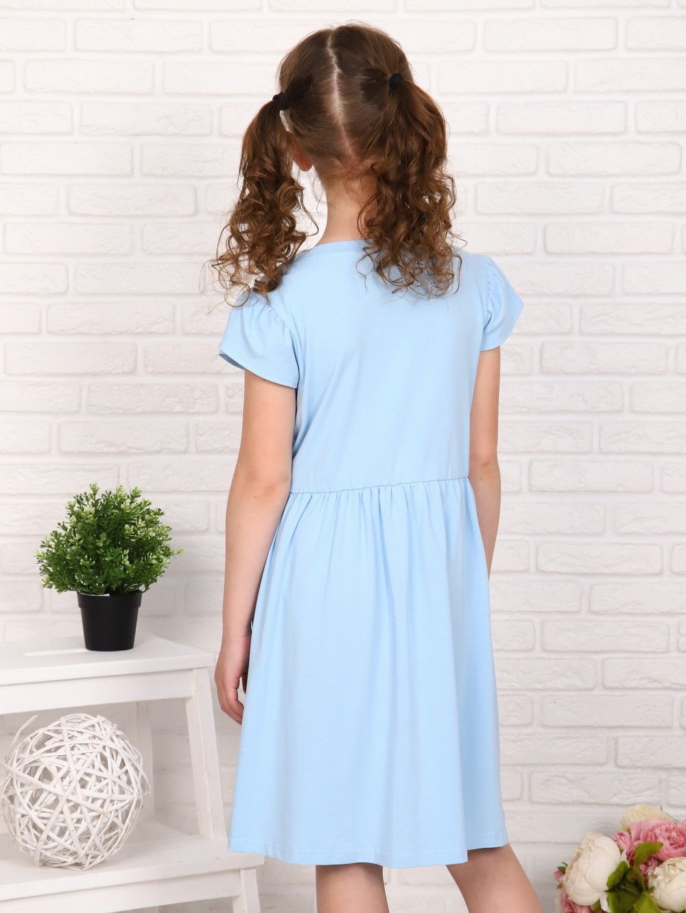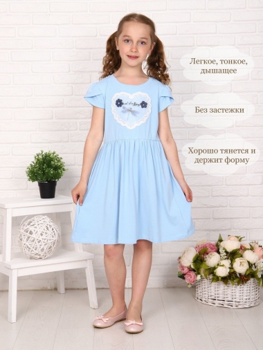 Платье для девочек дошкольного и младшего школьного возраста, из однотонного трикотажного полотна - кулирка с лайкрой. Прилегающего силуэта, отрезное по линии талии, расклешенное от линии талии, с втачным коротким рукавом. Нижние части переда и спинки присборены на резинку. Рукава состоят из двух частей, наложенных друг на друга. По окату рукава присборены. Низ частей рукавов обметан и подогнут. Срез горловины обработан окантовочной лентой. Низ изделия подогнут. Спереди настрочена декоративная нашивка.
