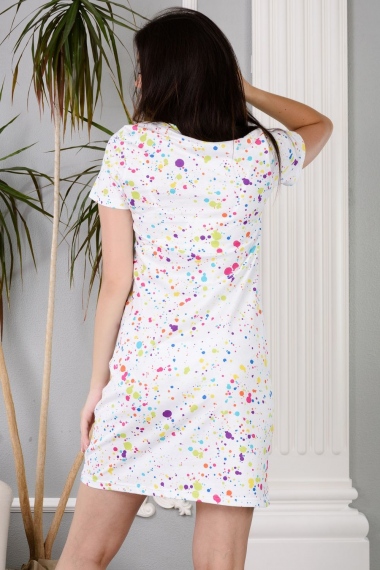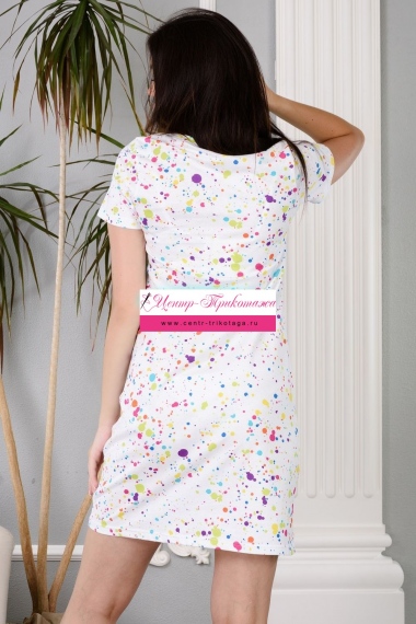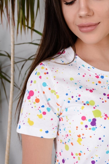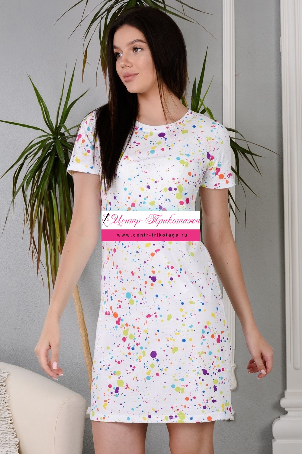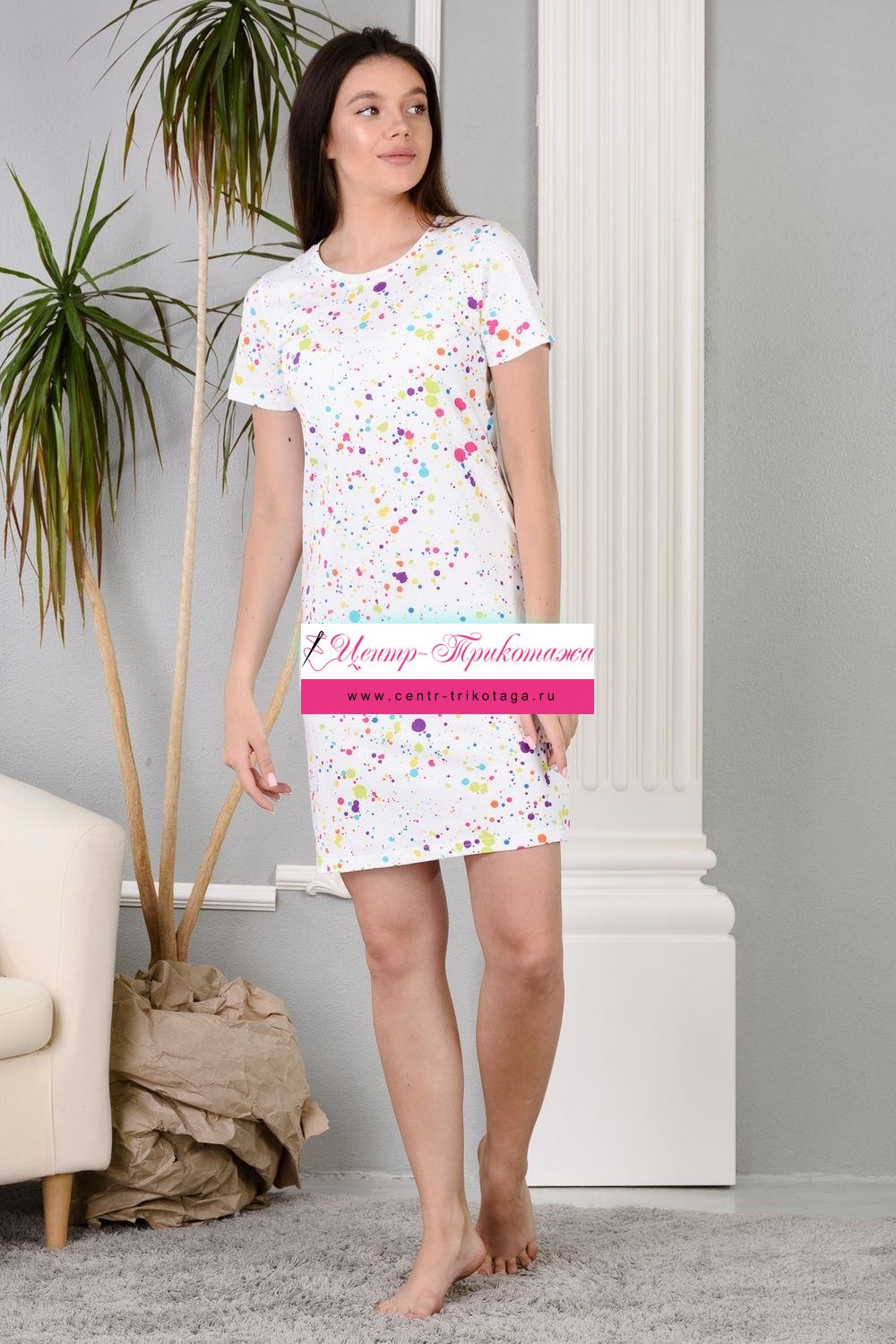 Сорочка женская белого цвета с радужными каплями, с коротким рукавом и вшивной круглой горловиной. Данная модель выполнена из трикотажного полотна кулирка (100% хлопок)