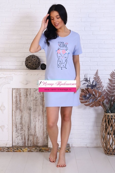 Сорочка женская из кулирного полотна, прямой силуэт, горловина круглая, спущенное плечо, рукав короткий, на полочке принт.