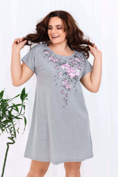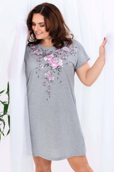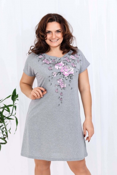 Нежная сорочка с оригинальным принтом в виде россыпи цветов, в лепестках которых - серебристый глиттер. Спущенная пройма. Простой, удобный крой. Для более свободной посадки рекомендуем заказывать на 1-2 размера больше