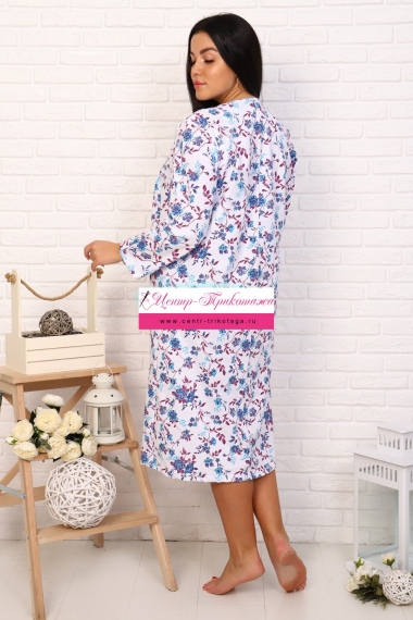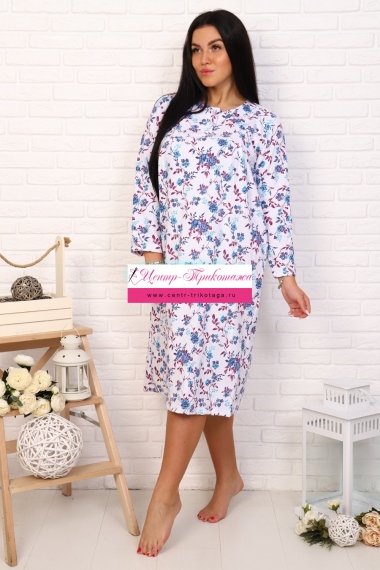 Ночная сорочка из футера с длинным рукавом. На кокетке планка с тремя пуговицами. Воротник декорирован кружевом. По линии отреза лифа небольшая сборка.