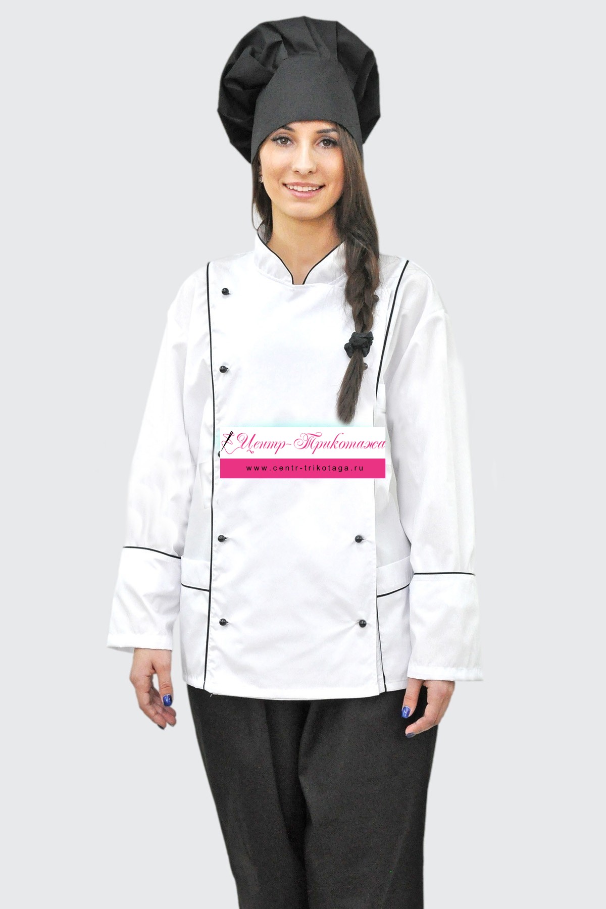 Костюм Повар женский повара женский состоит из куртки (кителя) и брюк. Куртка прямого силуэта с двубортной застежкой и двумя нижними карманами. Воротник-стойка свободного прилегания, длинный втачной рукав с манжетой. Куртка декорирована кантом и пуклями контрастного цвета. Брюки прямые, с поясом на резинке. Костюм изготовлен из устойчивой к загрязнениям ткани, максимально закрывает тело и личную одежду работника, практичен и удобен.