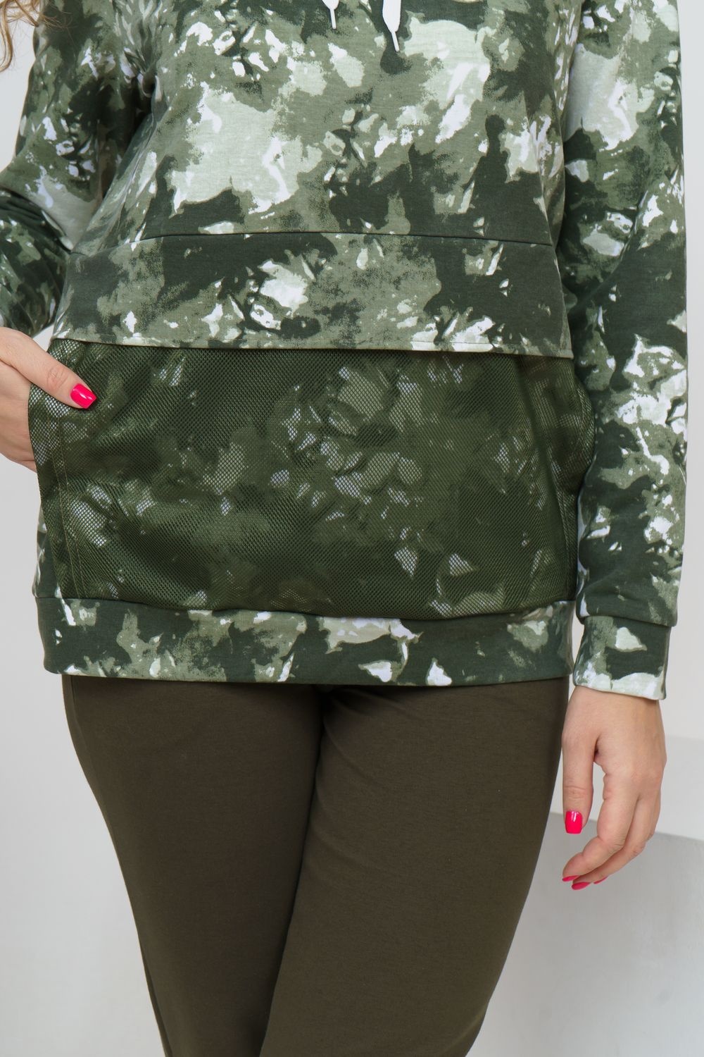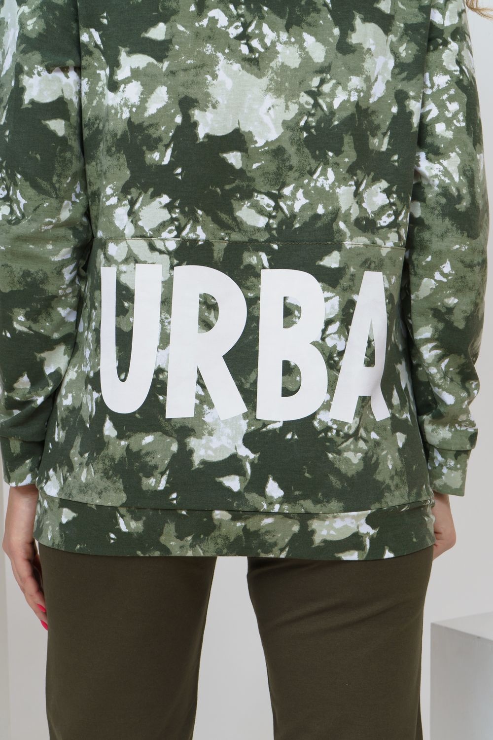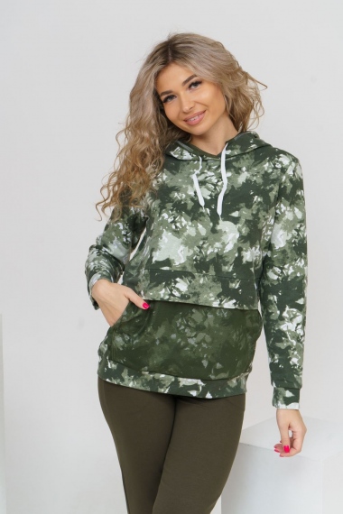 Модная толстовка выполнена из футера с дизайном тай - дай. На капюшоне и кармане присутствует отделка из сетки. На спинке толстовки белая модная надпись, которая сопровождает современную одежду и помогает нам создать индиввидуальность и образ в целом. Данную модель можно приобрести с брюками - костюмом 36516.