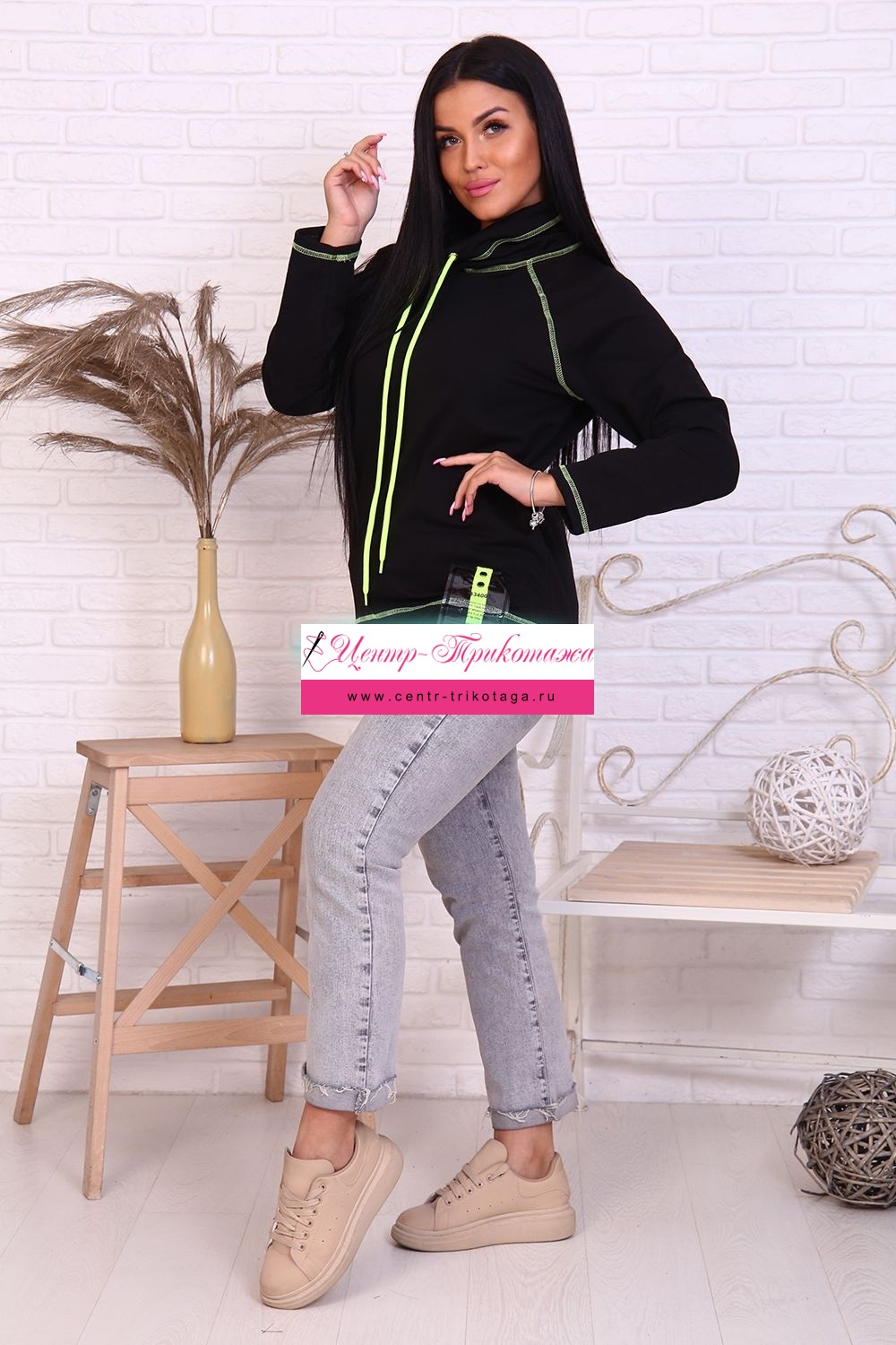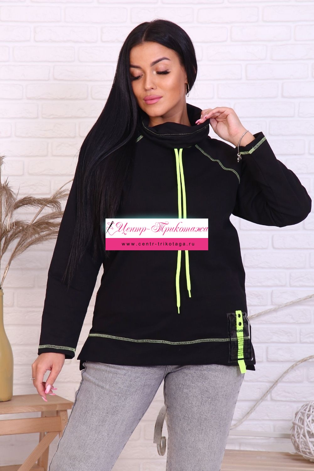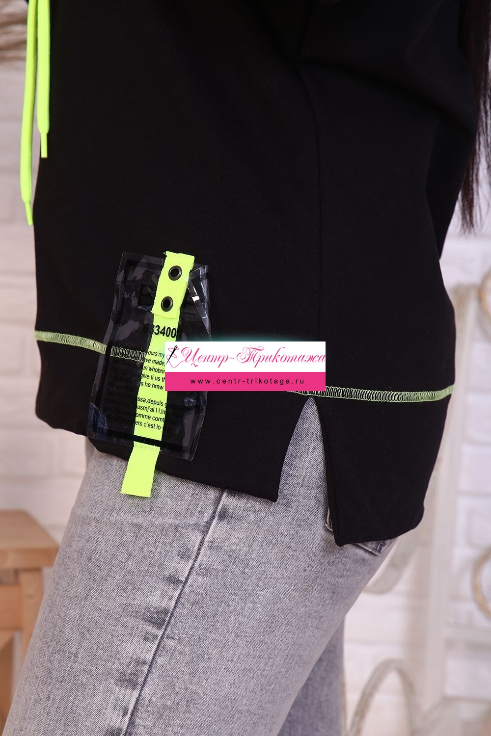 Интересный лонгслив с декоративным элементом, находящимся в левом нижнем углу изделия. Расположенный сверху хомут очень гармонично подходит под модель, а неоновый шнур дополняет нитки и декор. Снизу изделия по бокам находятся разрезы. Лонгслив выполнен из футера 2-х нитки: 73% хлопка, 22% полиэстер, 5% лайкра, плотностью 220 гр.