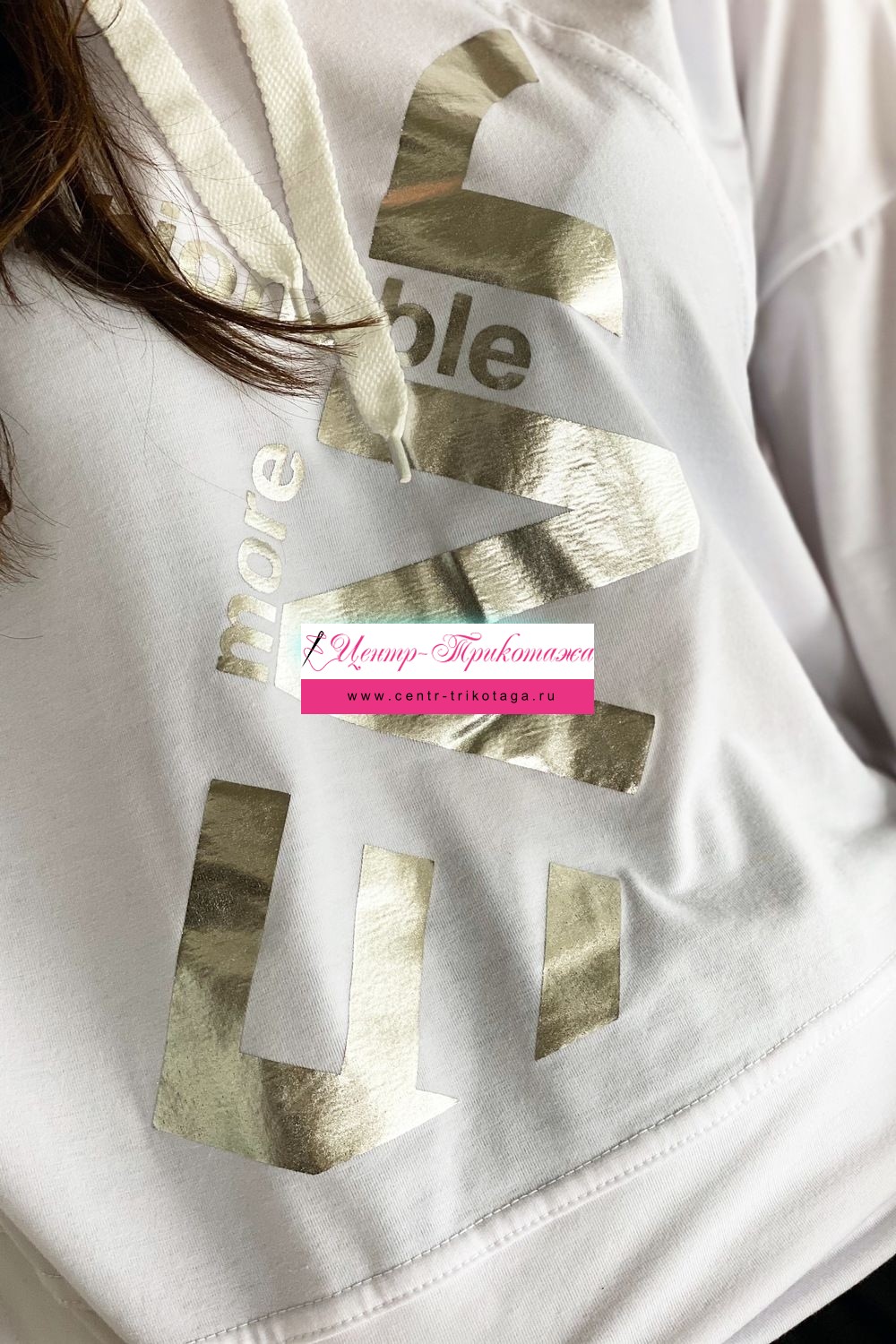 Толстовка прямая, укороченная, с капюшоном, на поясе. Рукав длинный, на манжете. Спинка удлиненная, на поясе. На полочке расположены симметричные кокетки и пояс. В нижней части боковых швов обработаны разрезы.