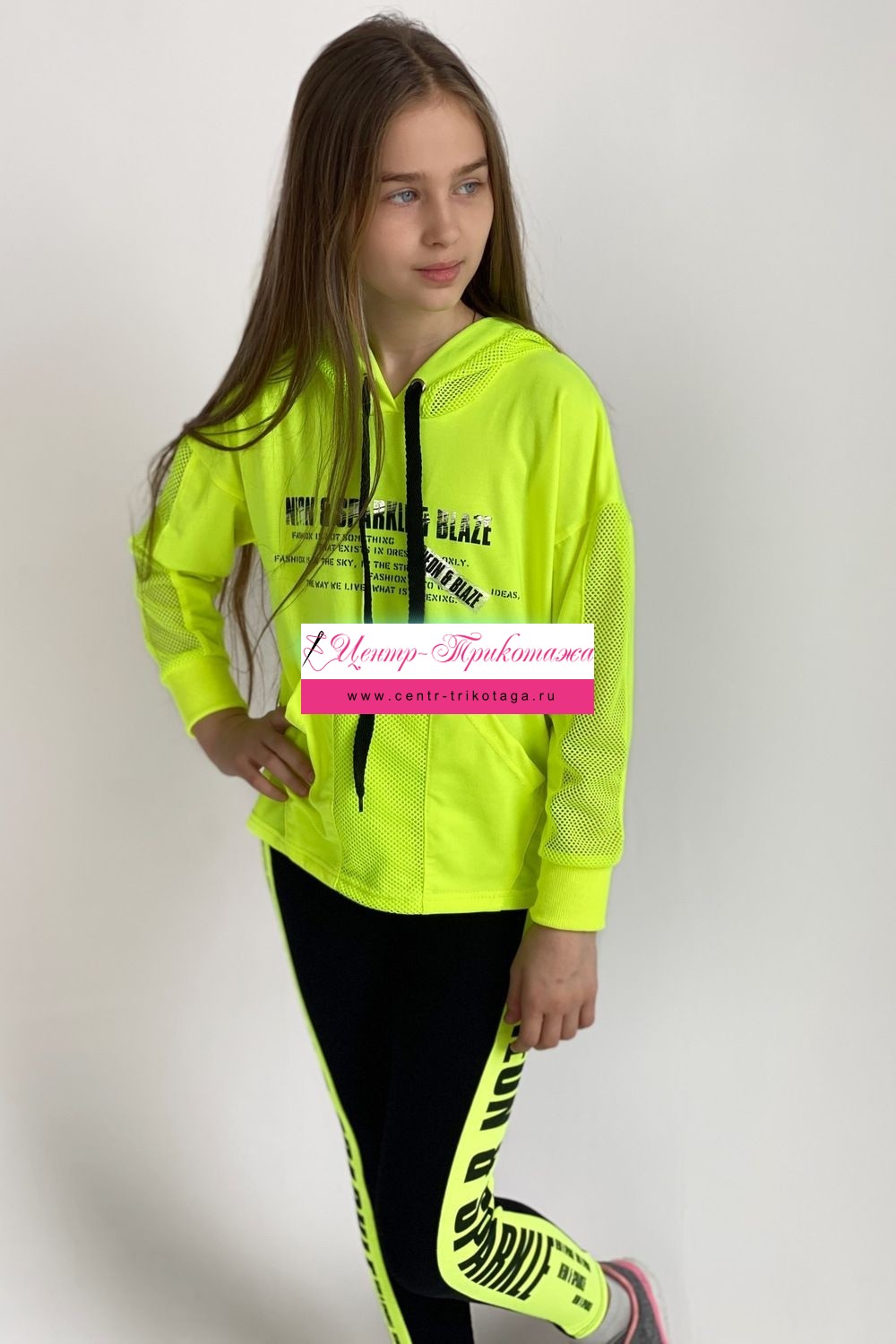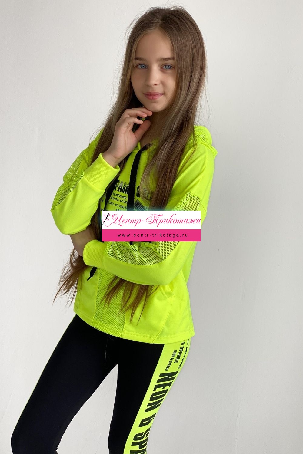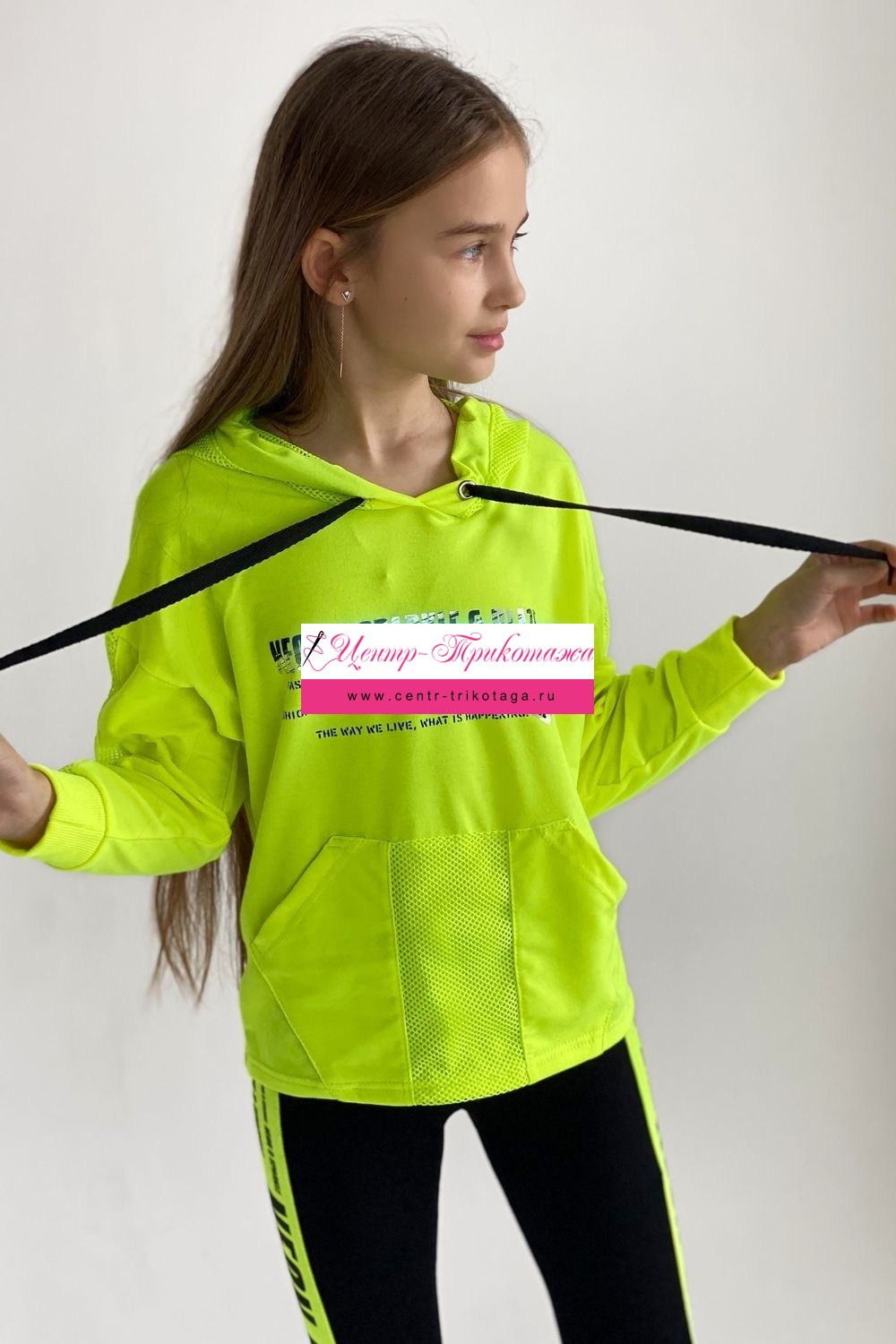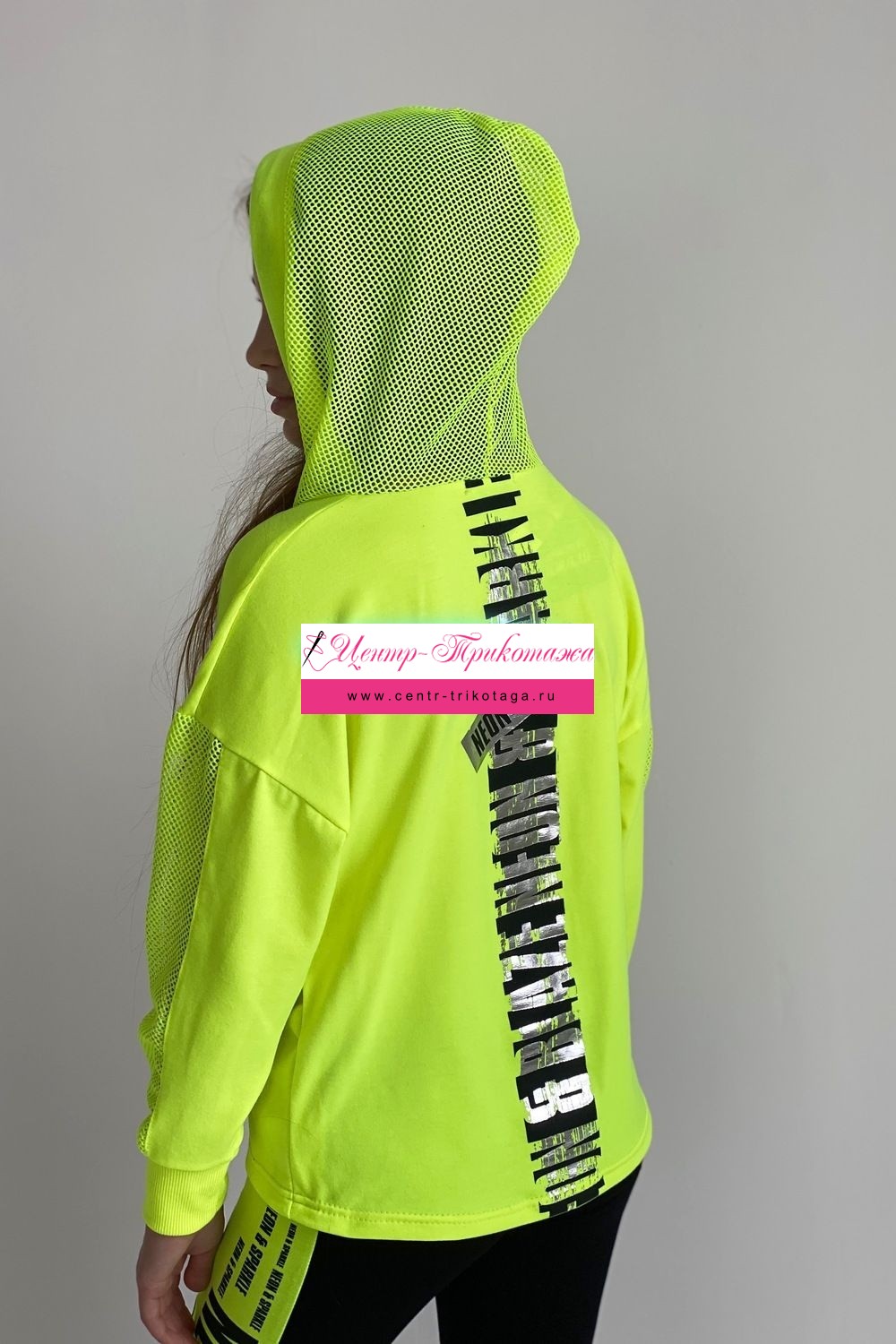 Толстовка прямая, свободная, с капюшоном из сетки, с удлиненной спинкой. Рукав длинный, со вставкой из сетки вдоль рукава, на эластичном манжете. На полочке расположен карман кенгуру .