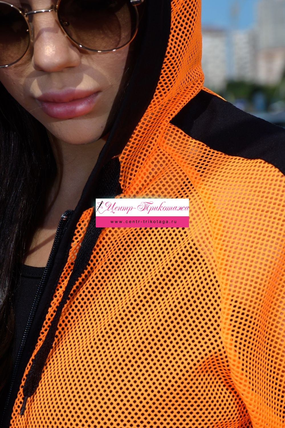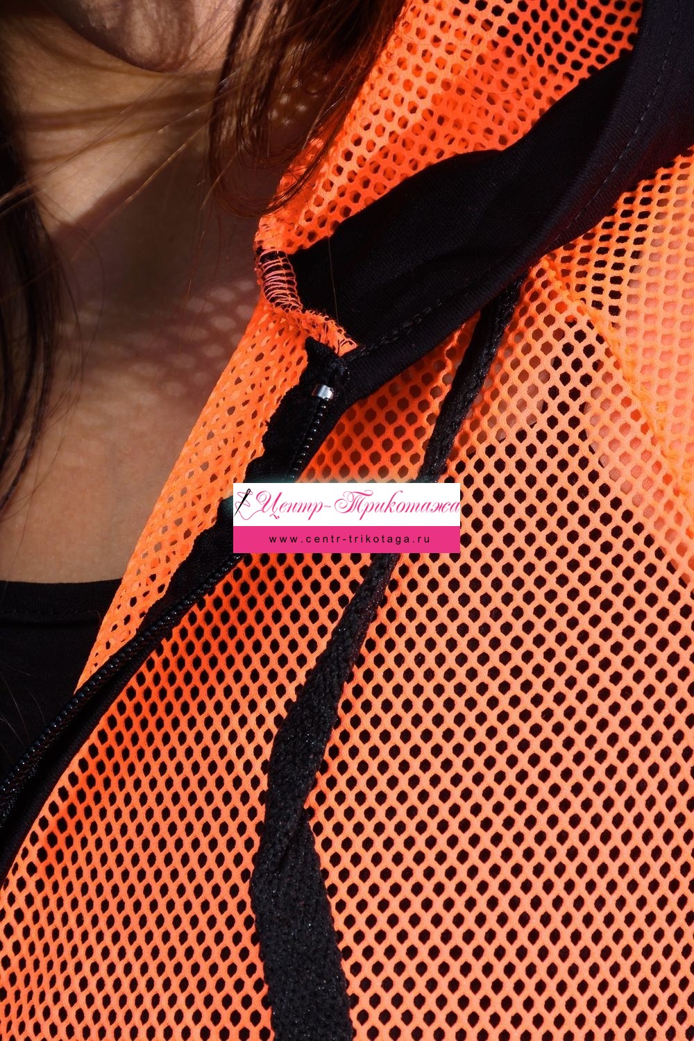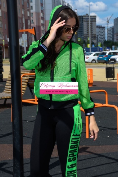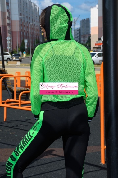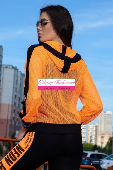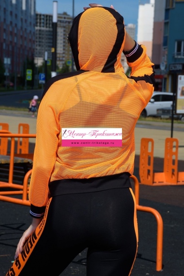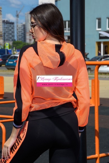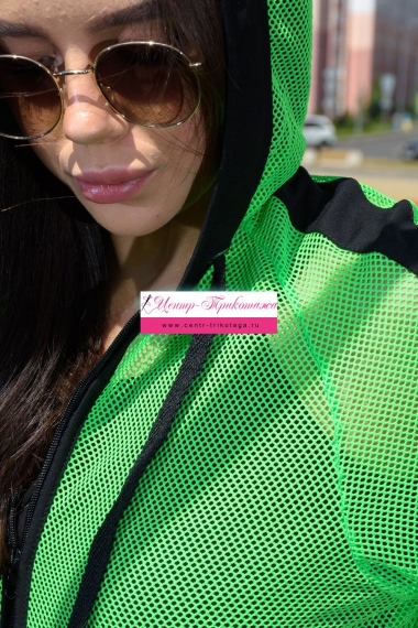 Толстовка с капюшоном из сетки, длиной до середины бедра. Рукав реглан длинный, из сетки, с контрастным лампасом вдоль рукава, на эластичном манжете. На полочке расположены фигурные карманы из сетки.