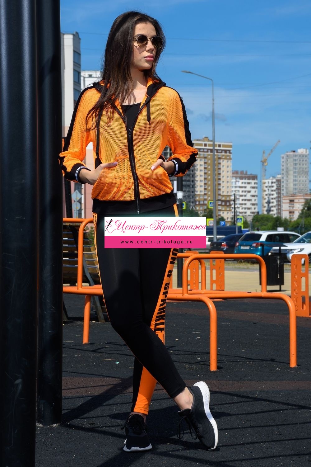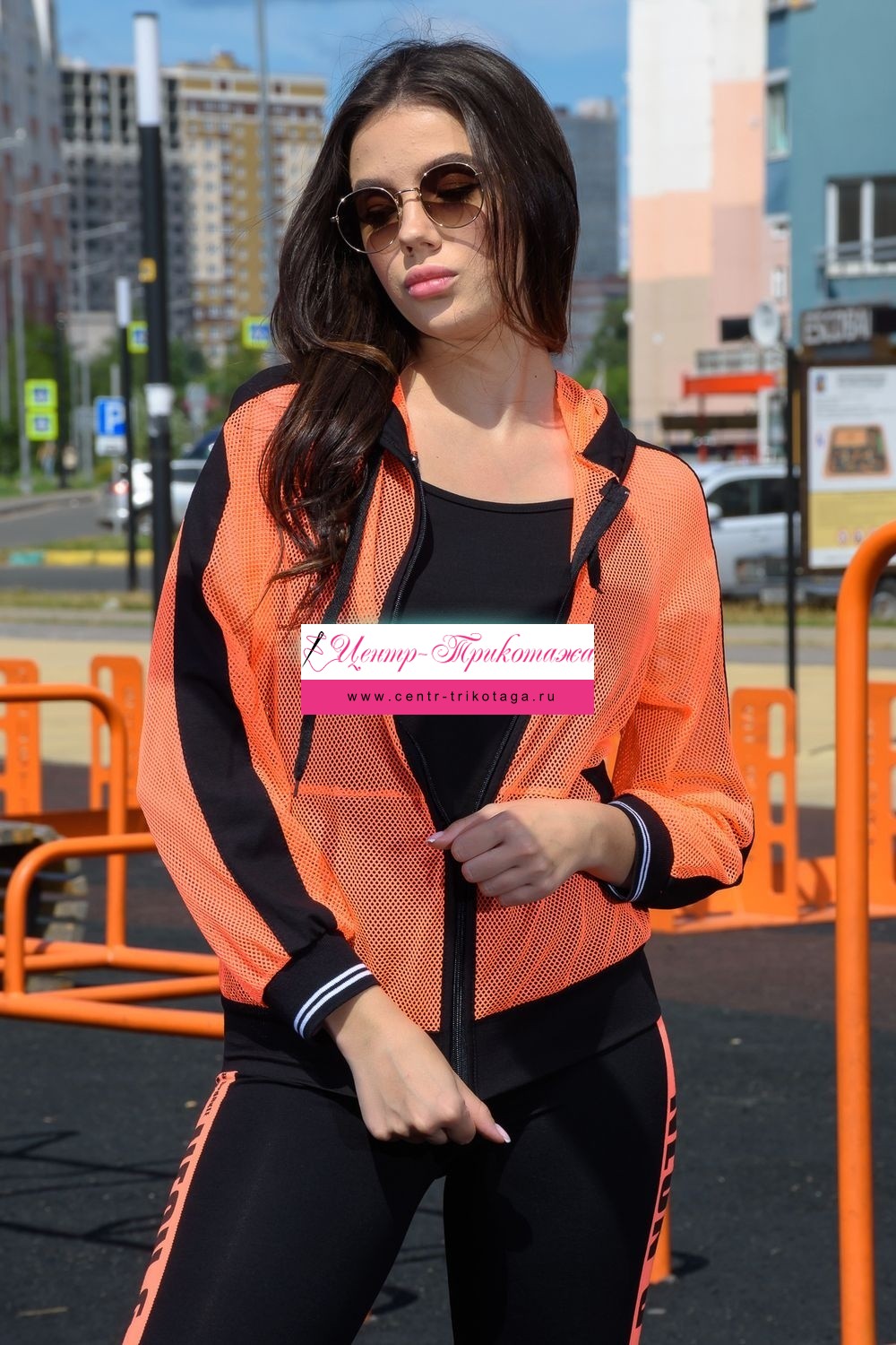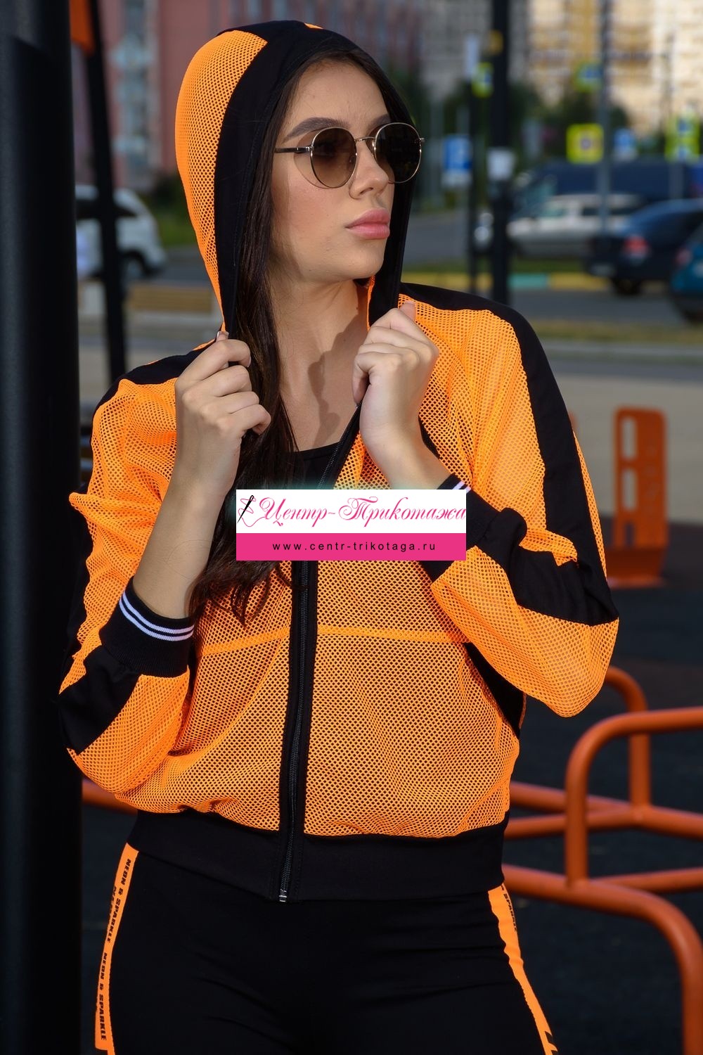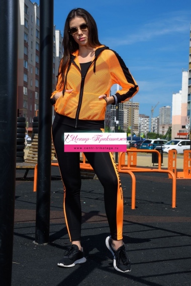 Толстовка с капюшоном из сетки, длиной до середины бедра. Рукав реглан длинный, из сетки, с контрастным лампасом вдоль рукава, на эластичном манжете. На полочке расположены фигурные карманы из сетки.