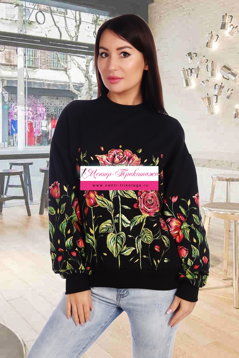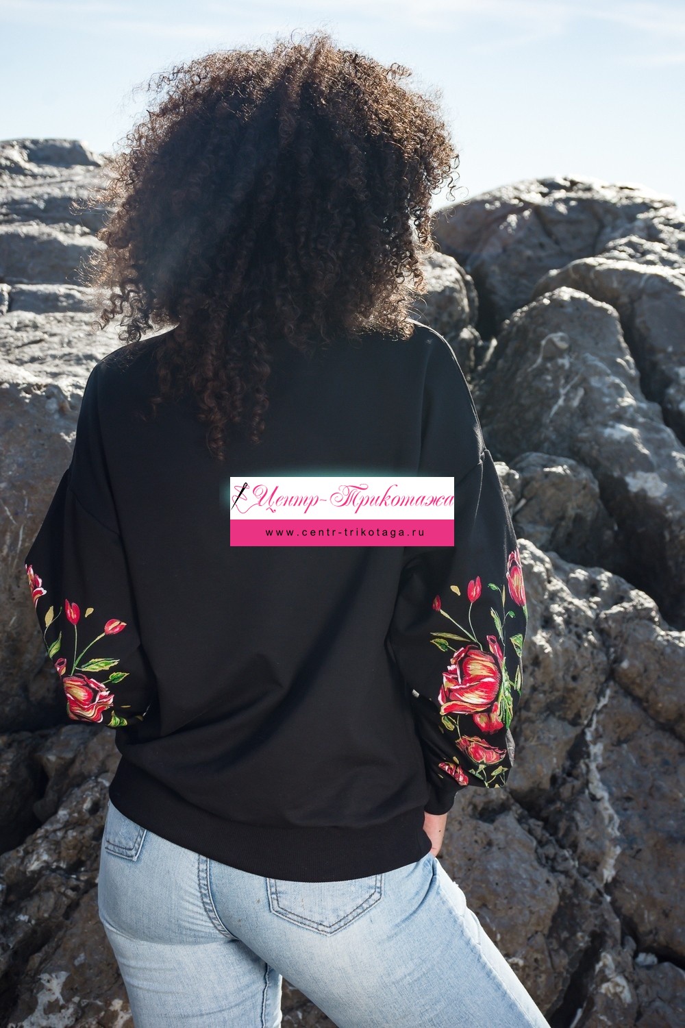 Универсальная модель, которую можно сочетать с шортами, джинсами, брюками, юбками. В этом свитшоте вы будете чувствовать себя комфортно, не теряя женственность и элегантность. Очень свободный крой. Горловина, манжеты рукавов и низа изделия изготовлены из плотной, качественной резинки кашкорсе, которая при эксплуатации не растягивается. Украшение свитшота-розы, в лепестках которых золотой глиттер.