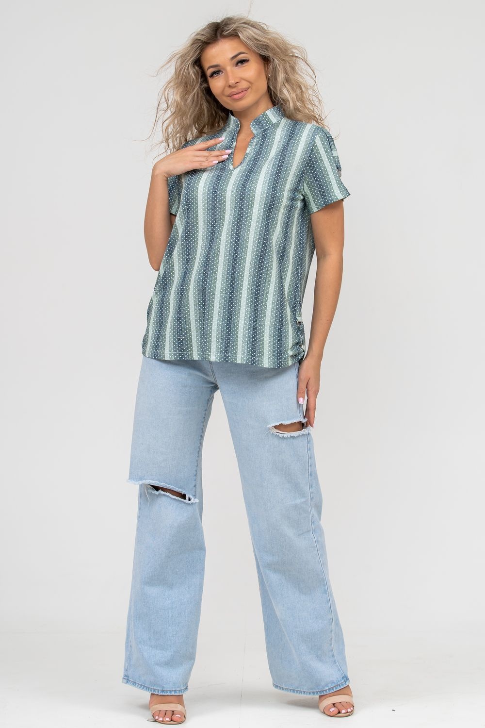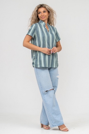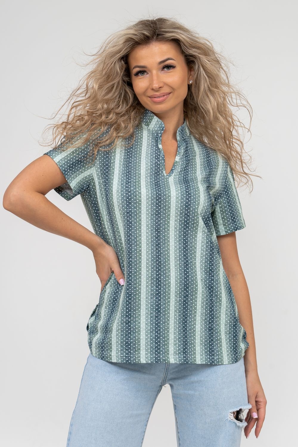 Женская туника-рубашка из 100% хлопчатобумажного полотна, сочетающая в себе всеми любимую полоску и не выходящий из моды горошек. Горловина с V - образным вырезом и воротником стойкой. Рукав и низ изделия с отделкой в виде полуколец, что делает тунику более привлекательной и по-своему красивой.