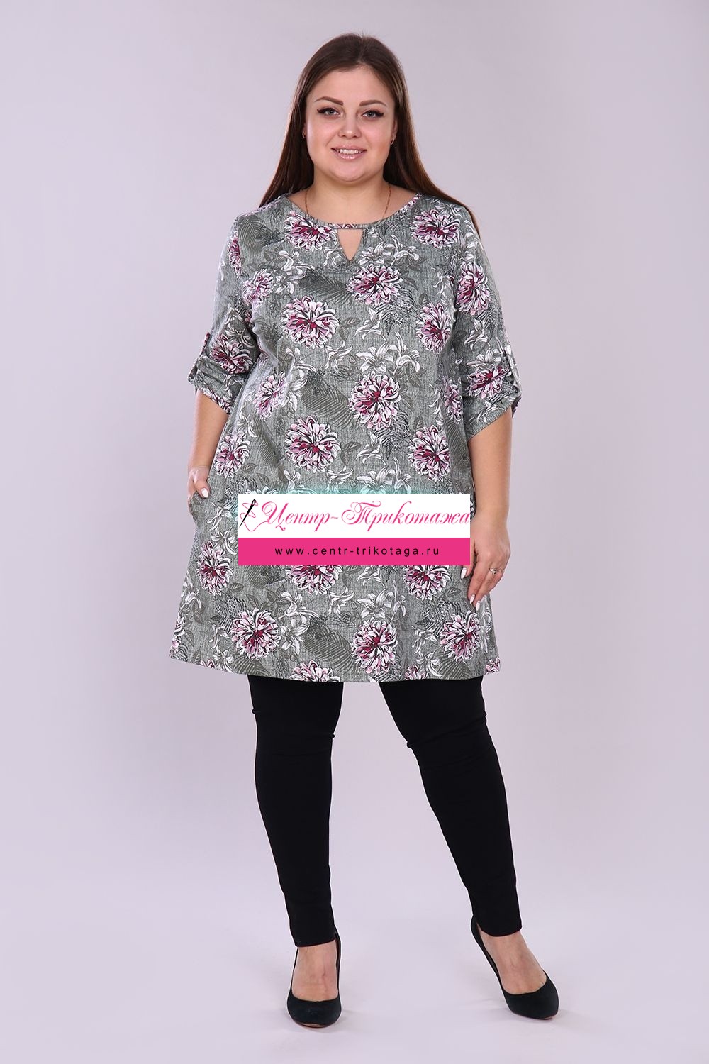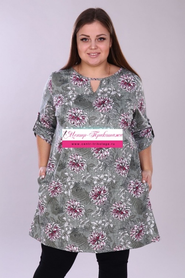 Удлинённая женская туника свободного кроя выполнена из 100% хлопчатобумажного полотна. По горловине расположен треугольный вырез, рукав 3/4. На рукавах имеются паты, закреплённые светлыми серебристыми пуговицами, что делает изделие более привлекательным. Данная туника для полноразмерных дам помогает скрыть недостатки фигуры и подчеркнуть достоинства, тем самым создавая стильный образ, в котором Вы будете чувствовать себя максимально комфортно и уверенно. На модели 52 размер