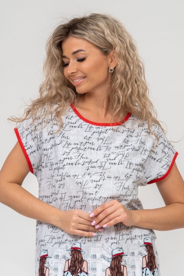 Женская туника прямого силуэта со спущенным плечом выполнена из 100% хлопчатобумажной ткани. Горловина и рукава обработаны ярким красным кантом, а крупный купонный рисунок по краю ткани придаёт изделию по-своему оригинальный вид. Данная модель идеально подойдёт для дома и отдыха.