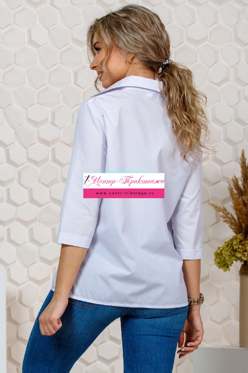 Рубашка белая офисная на пуговицах, низ прямой, с воротником, рукав 3/4.