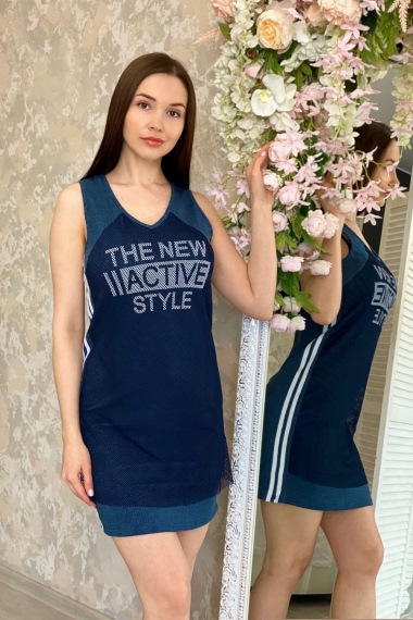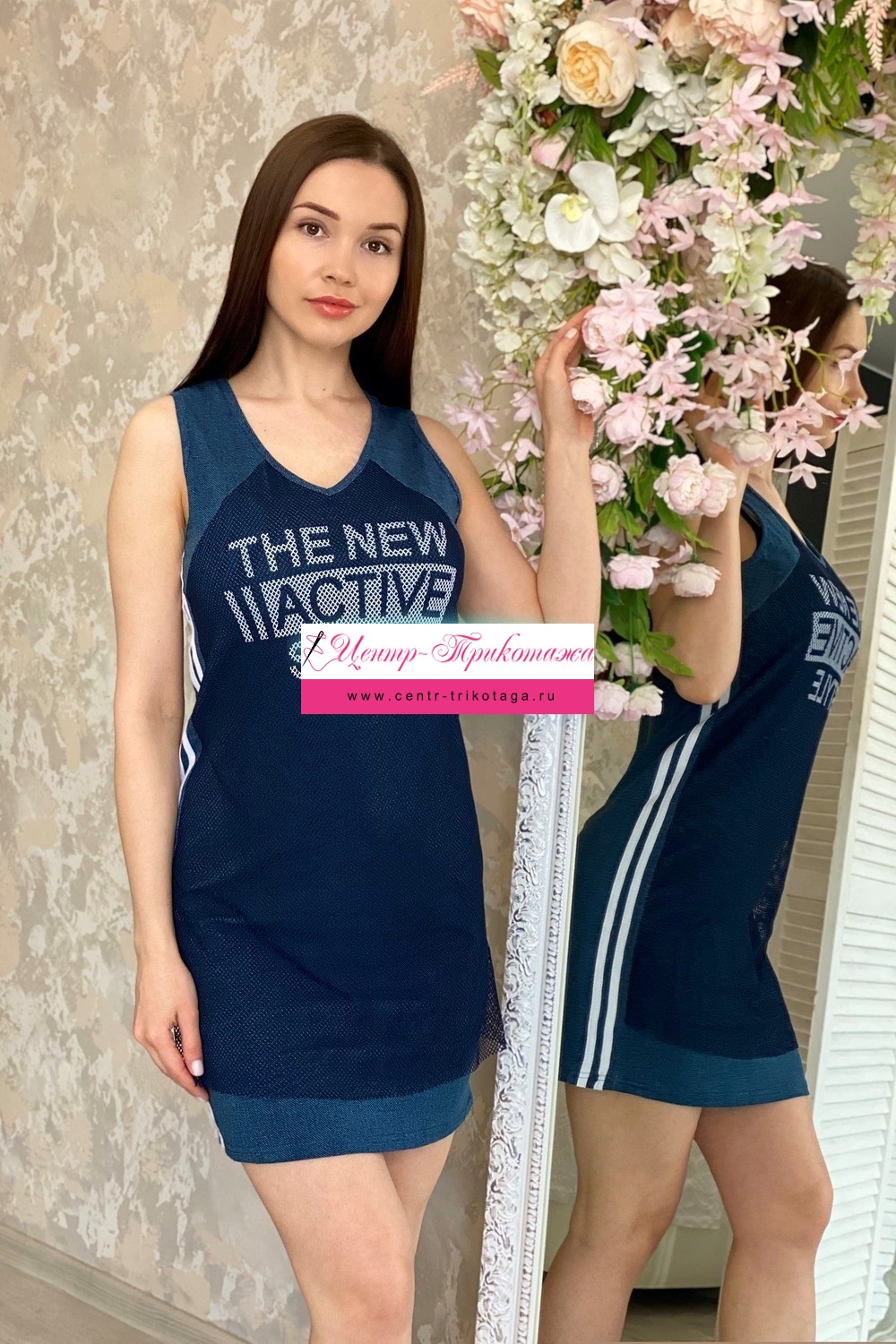 Туника-майка в спортивном стиле, полуприлегающего силуэта средней длины, с V-образной горловиной, без рукавов. Полочка с симметричными кокетками в верхней части. Средняя часть полочки выполнена из сетки. Вдоль боковых швов расположены вставки с лампасами из отделочного полотна. Горловина и проймы обработаны бейкой из основного полотна.