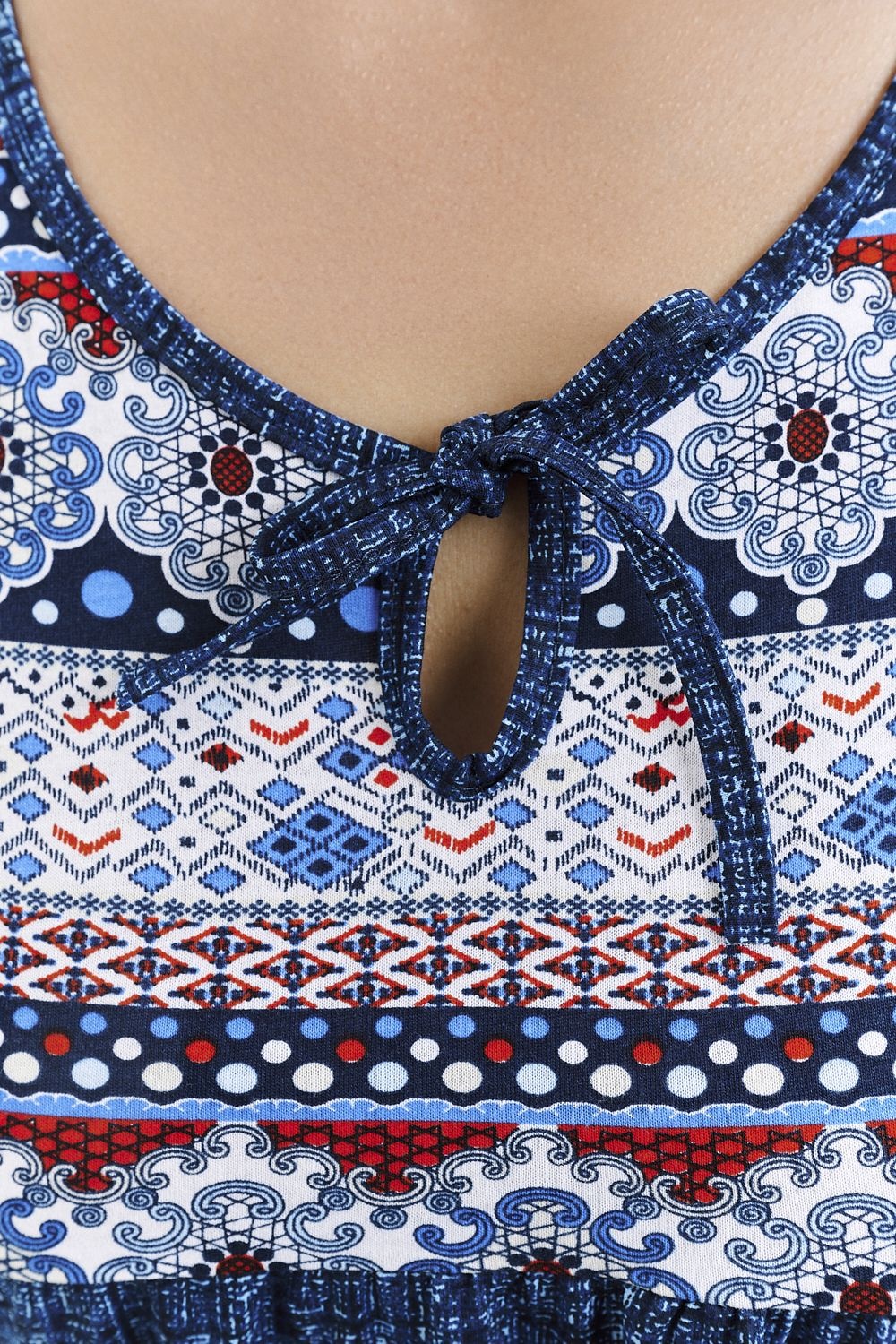 Стильная женская туника из кулирки. Горловина с завязками, короткие рукава, узорчатые вставки, карманы и окантовка, общая длина туники чуть выше коленей.