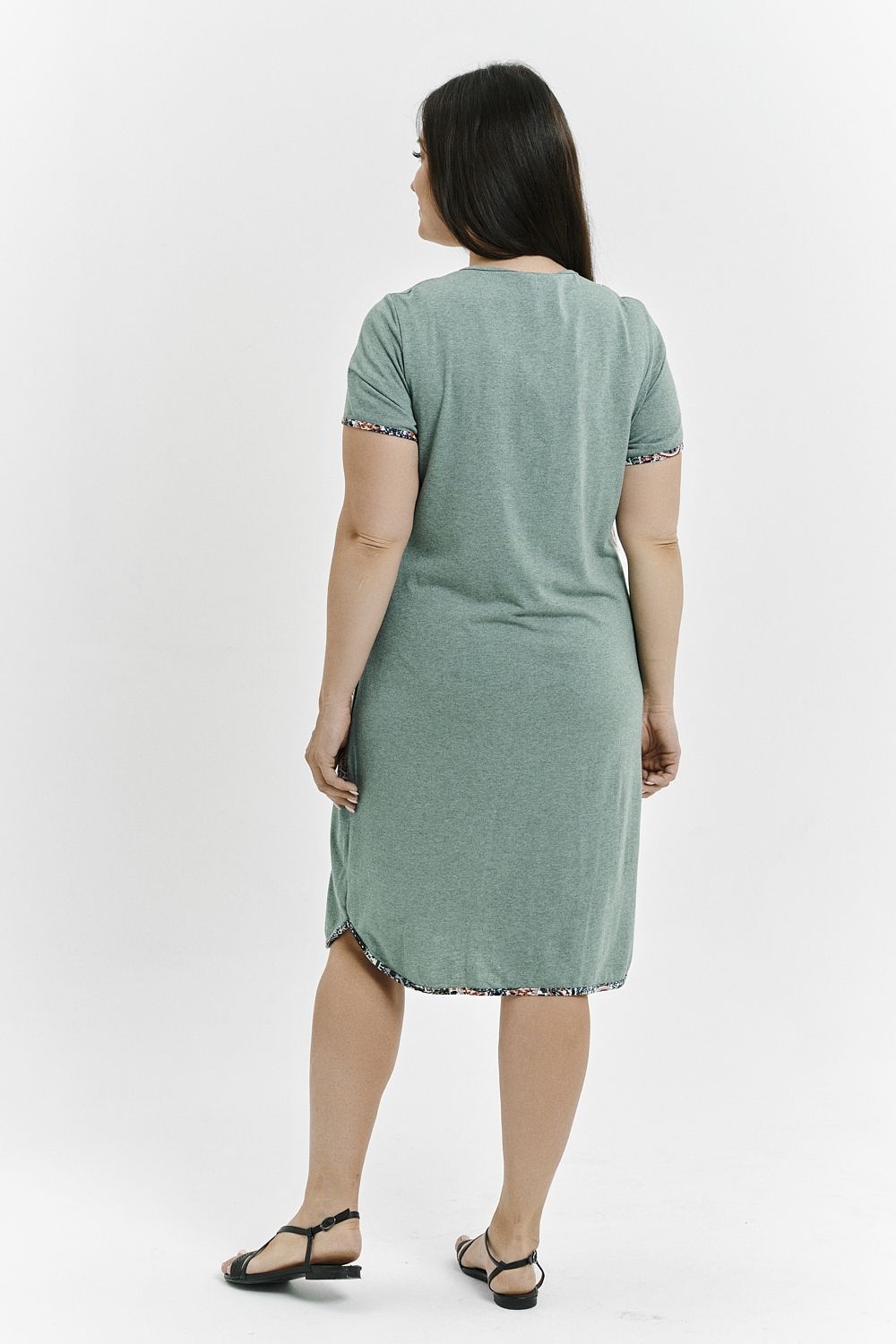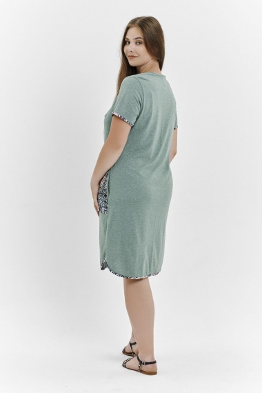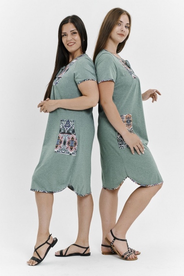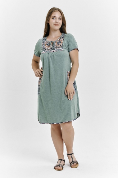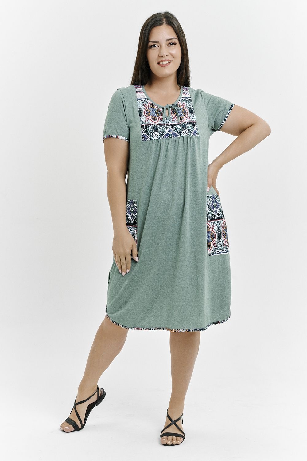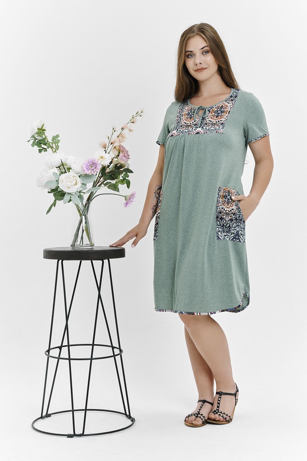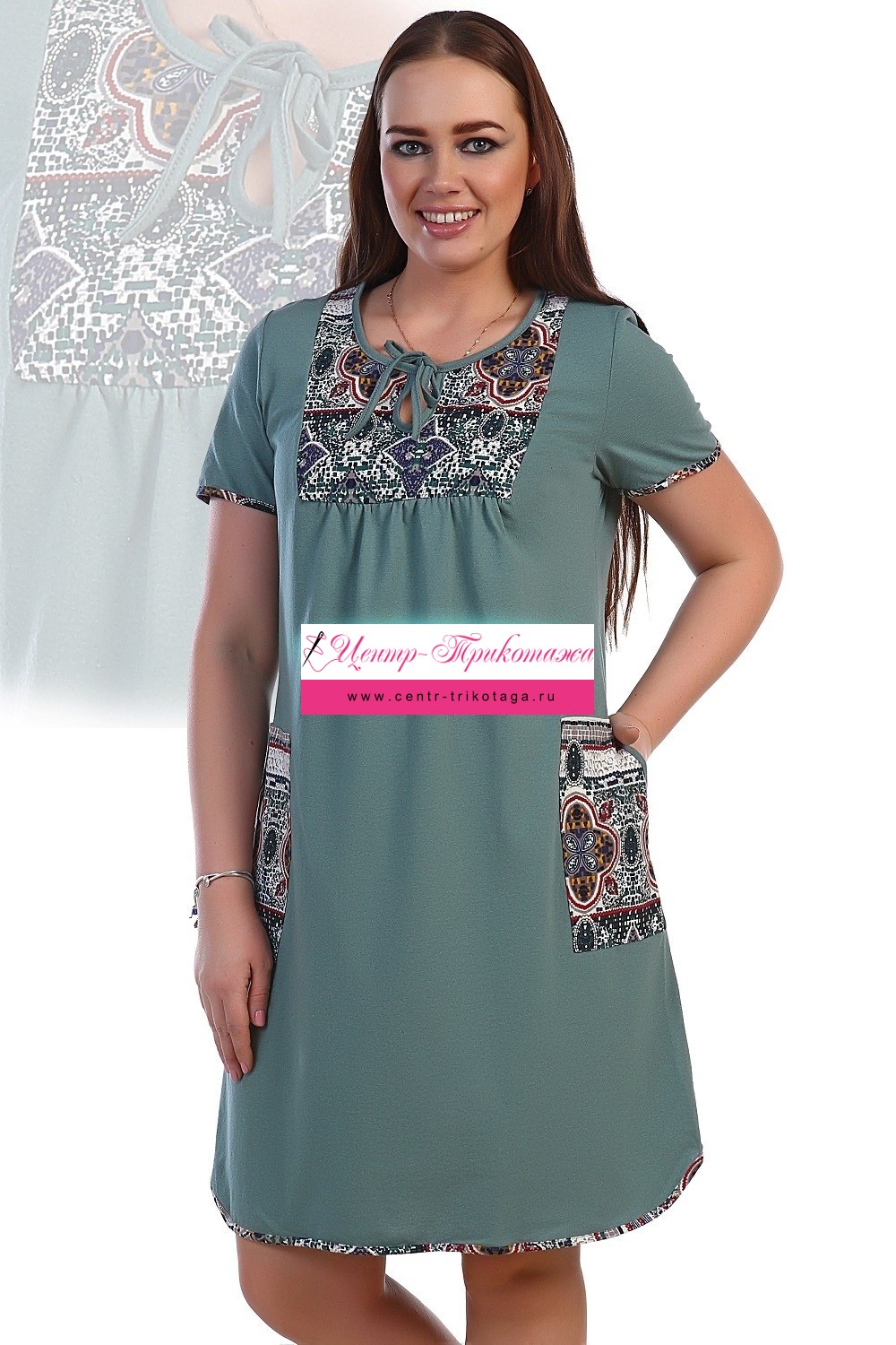 Стильная женская туника из кулирки. Горловина с завязками, короткие рукава, узорчатые вставки, карманы и окантовка, общая длина туники чуть выше коленей.