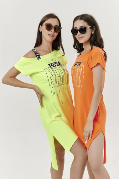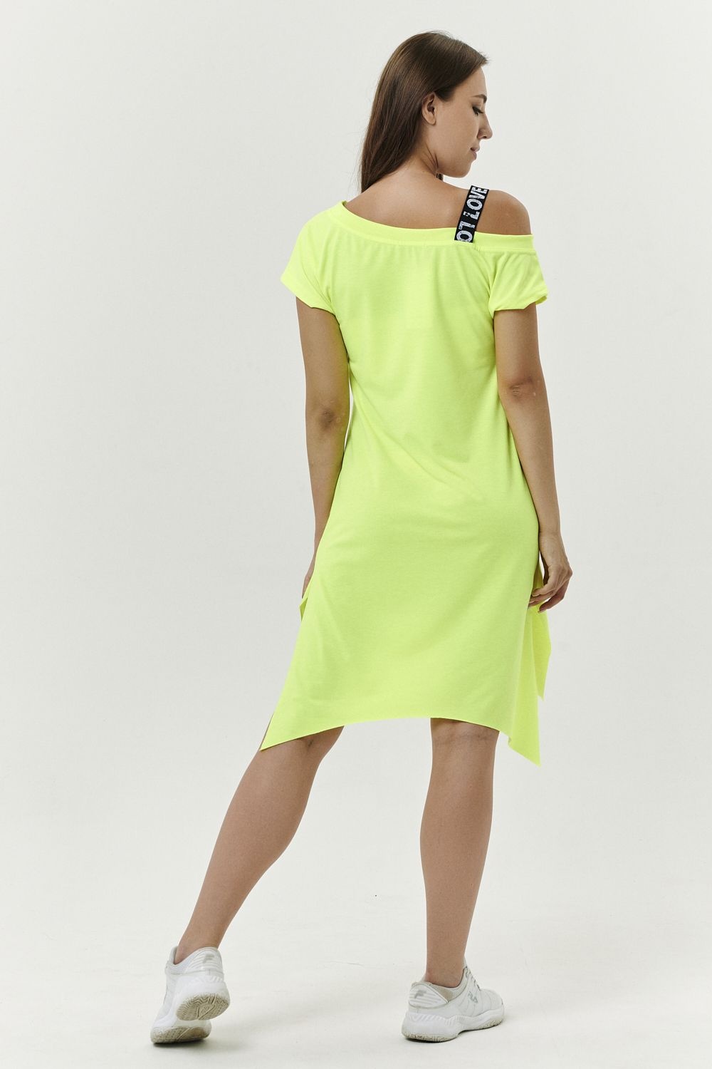 Туника полуприлегающего силуэта, длиной выше колена спереди и удлиненной спинкой сзади, с фигурной линией низа. Рукав цельнокроеный, короткий. В нижней части боковых швов обработаны разрезы. Горловина асимметричная с эластичной бретелью, обработана обтачкой из основного полотна.