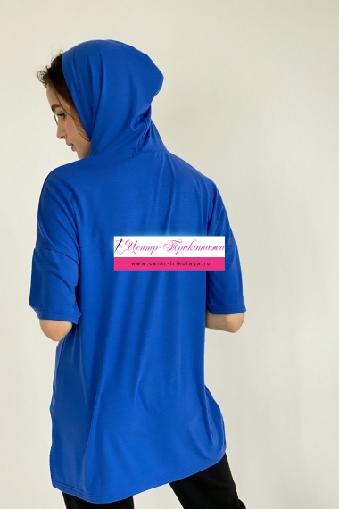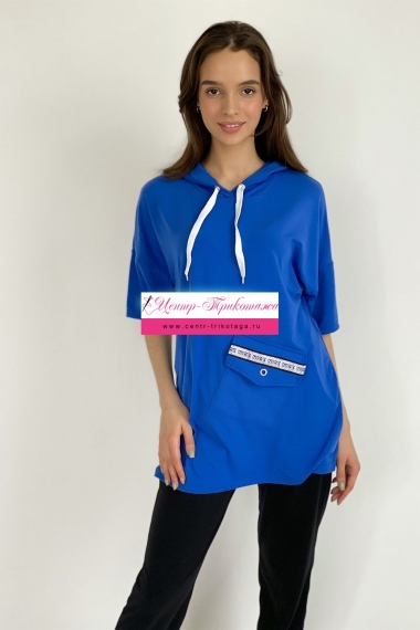 Туника прямая, свободная, с капюшоном, с удлиненной спинкой. Рукав короткий. На полочке расположен накладной карман с клапаном. В нижней части боковых швов обработаны разрезы.
