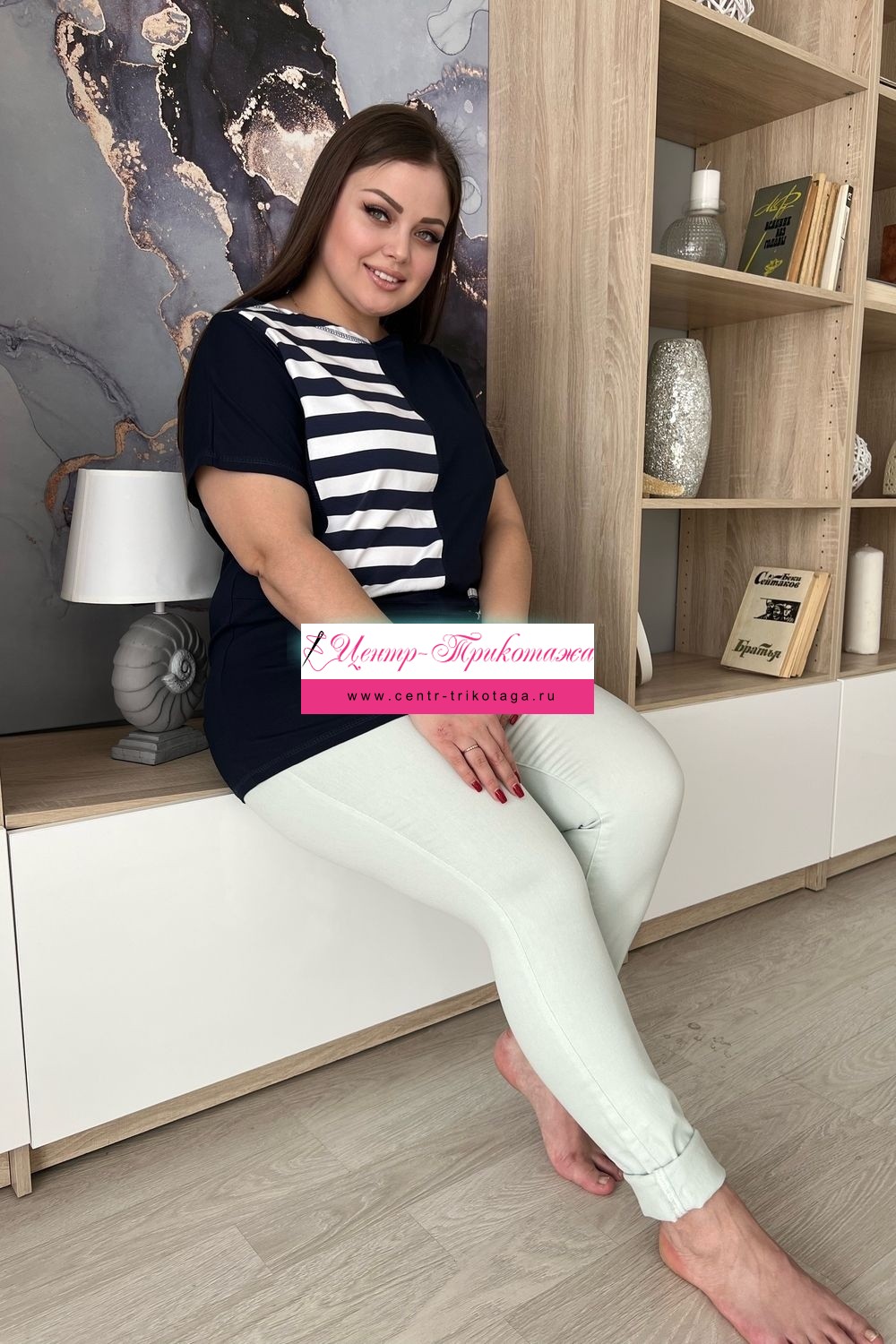 Туника женская прямого силуэта с цельнокроенным коротким рукавом. На полочке вставка и накладной карман из ткани в полоску. На модели 52 размер