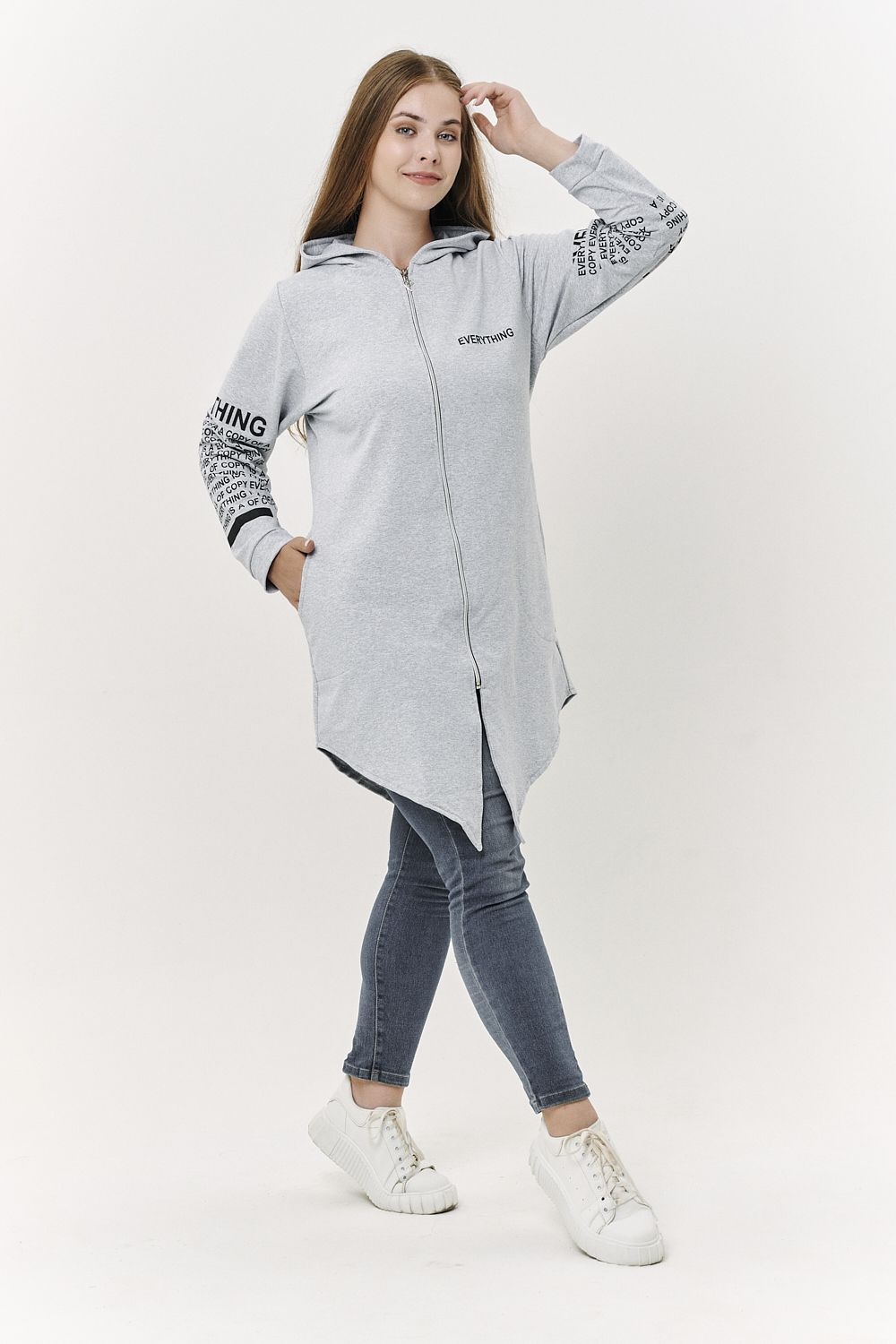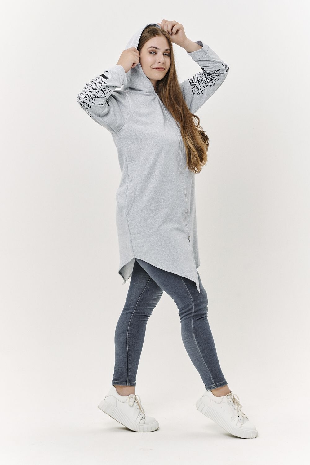 Туника необычного кроя из футера с лайкрой. Длинные рукава, общая длина до коленей спереди, более коротко по бокам. На молнии, с капюшоном. Дизайн в виде принтов с надписями