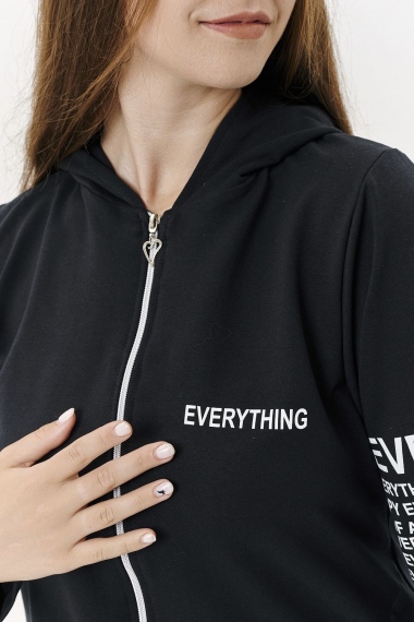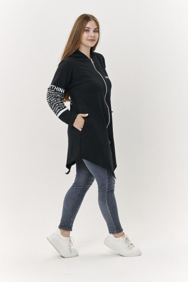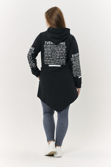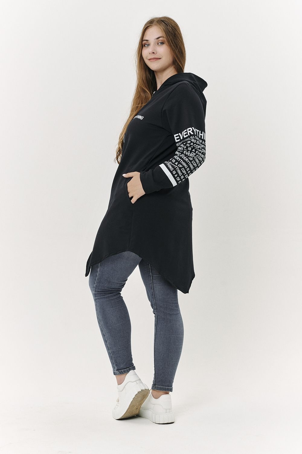 Туника необычного кроя из футера с лайкрой. Длинные рукава, общая длина до коленей спереди, более коротко по бокам. На молнии, с капюшоном. Дизайн в виде принтов с надписями