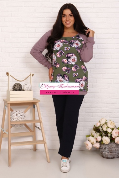 Туника прямого силуэта, длиной выше колена, с фигурной линией низа, с удлиненной спинкой, с округлой горловиной, с карманами в боковых швах. Рукав цельнокроеный, короткий. Горловина и проймы обработаны бейкой из основного полотна.
