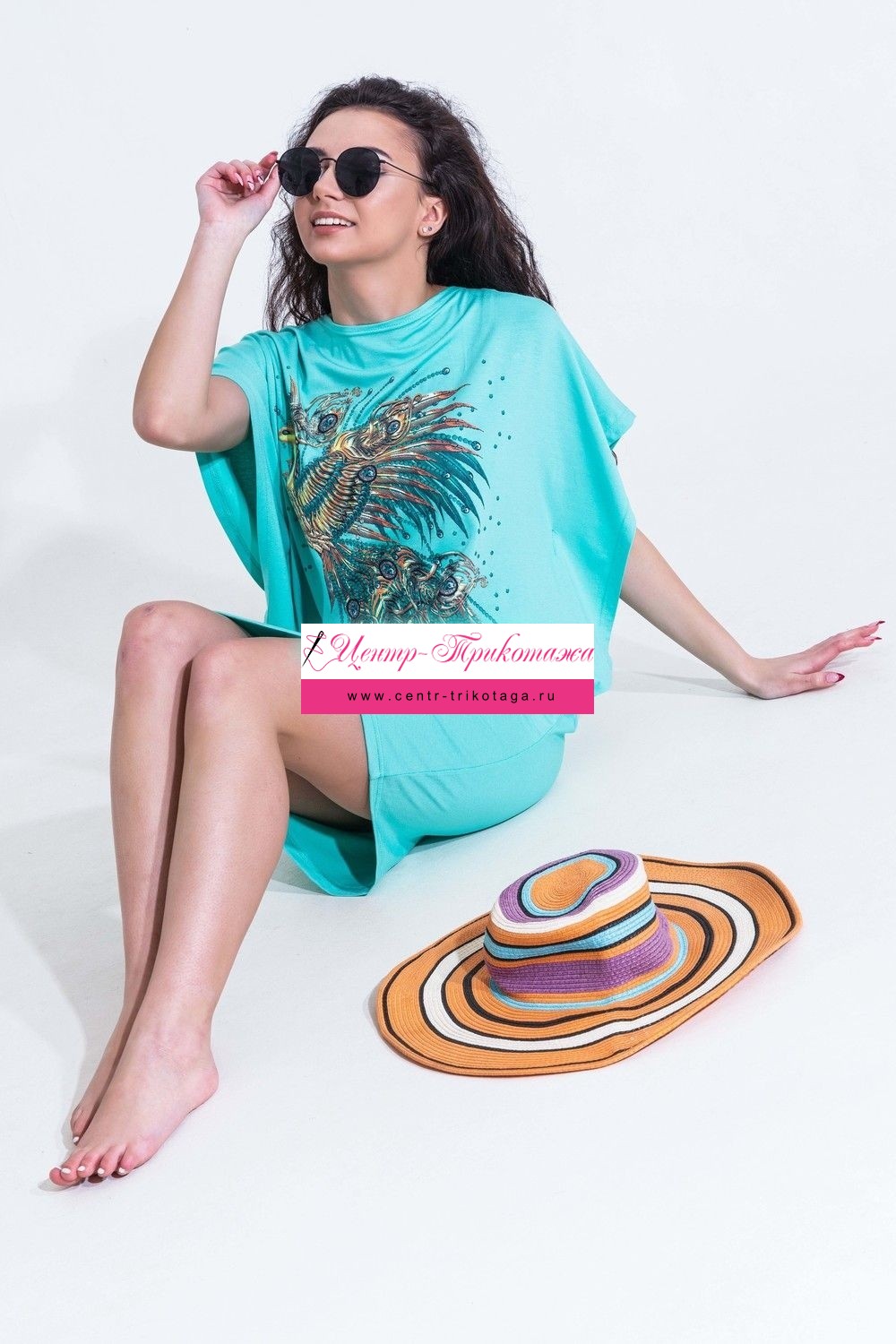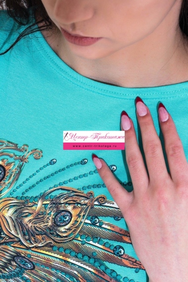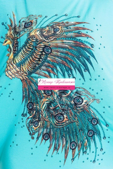Туника из вискозы с широкими рукавами. Принт в виде сказочной птицы с орнаментами, общая длина до середины бедра, рукав короткий. Пять расцветок — бирюзовая, малиновая, ментоловая, фуксия и шоколадная