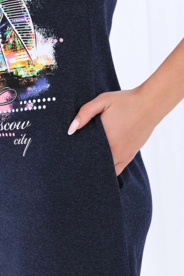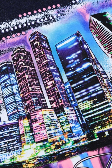 Стильная туника из кулирки. Принт изображает панораму небоскребов Москва-Сити, фиолетовая окантовка. Рукав короткий, длина чуть выше коленей. Оттенок ткани может отличаться