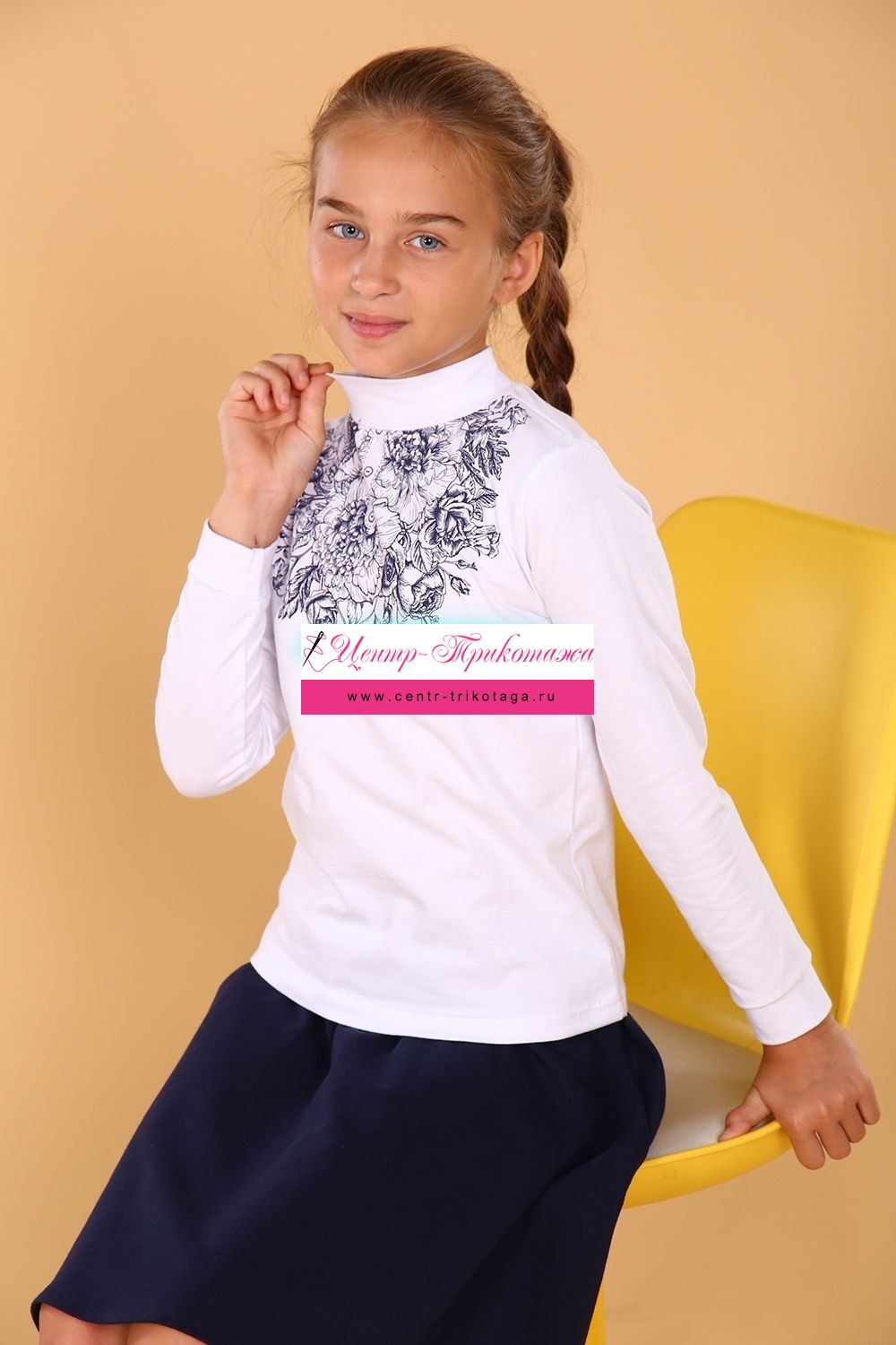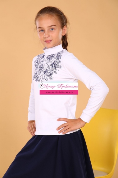 Школьная водолазка из высококачественного трикотажного полотна на хлопковой основе с добавлением эластана. Длинный рукав. Нарядность и романтичность изделию придает принт в виде цветов. Прекрасно будет смотреться в качестве школьной формы, как альтернатива классической блузке. Удобна в качестве повседневной одежды. Хорошо сохраняет цвет и форму при активной носке и после многократных стирок при 30 градусах. Синяя юбка на фото артикул 11594.